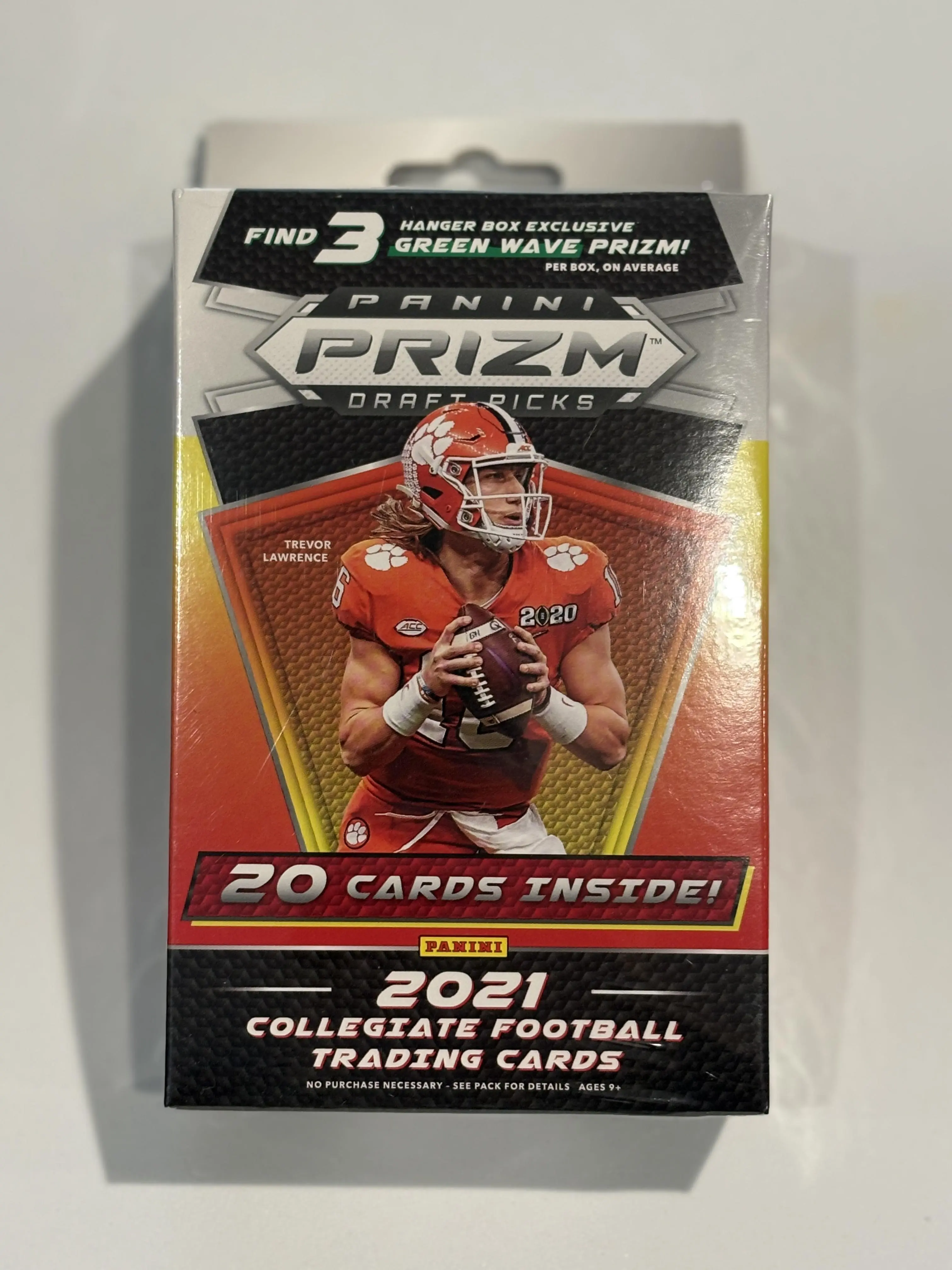 2021 Panini Prizm Draft Picks Hanger Box. 20 cards inside! Find 3 hanger box exclusive green wave Prizm cards per box on average. Look for hanger box exclusive purple pulsar prizms numbered to 25! Look for the ultra-rare on campus insert!