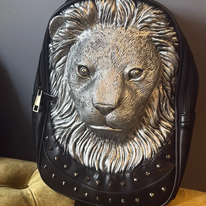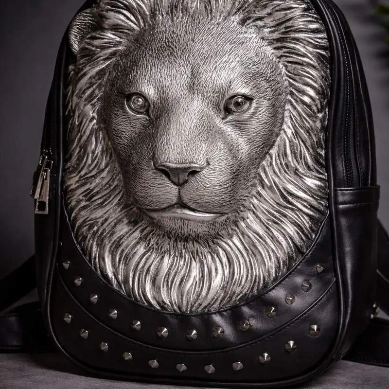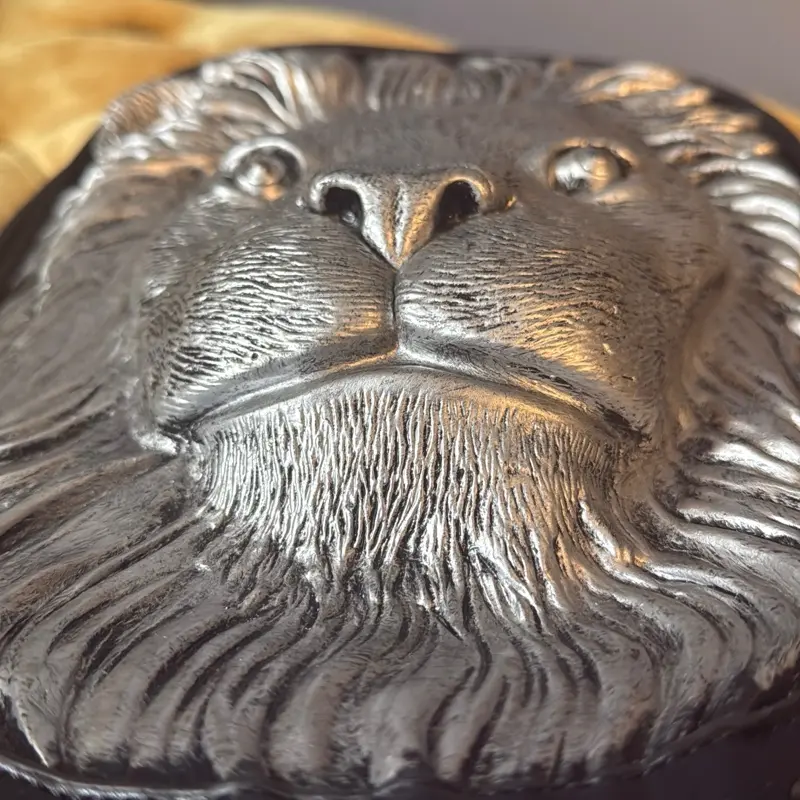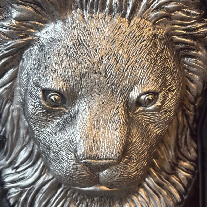 3D lion head with silver metallic finish over black base. Detailed mane and facial structure create a premium, dominant luxury streetwear look.