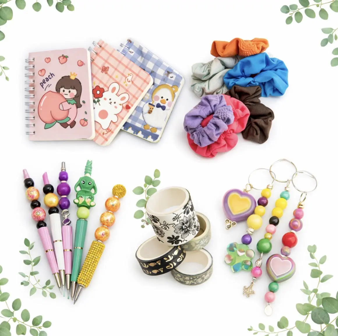 Each bundle includes a variety of handmade items such as beaded pens, scrunchies, keychains, small accessories, and more. Items are pre-made and randomly selected. Every bundle includes multiple items and offers great value. No duplicates within one bundle.