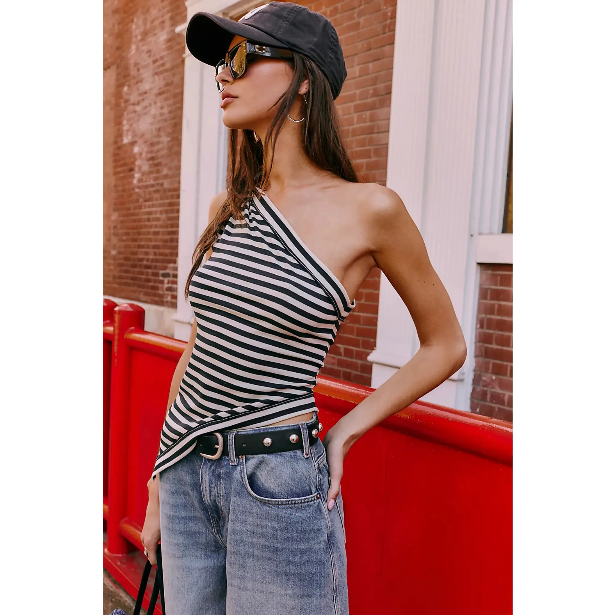 Features: Soft cotton blend, one-shoulder neckline, knotted detail, asymmetrical hem, striped print