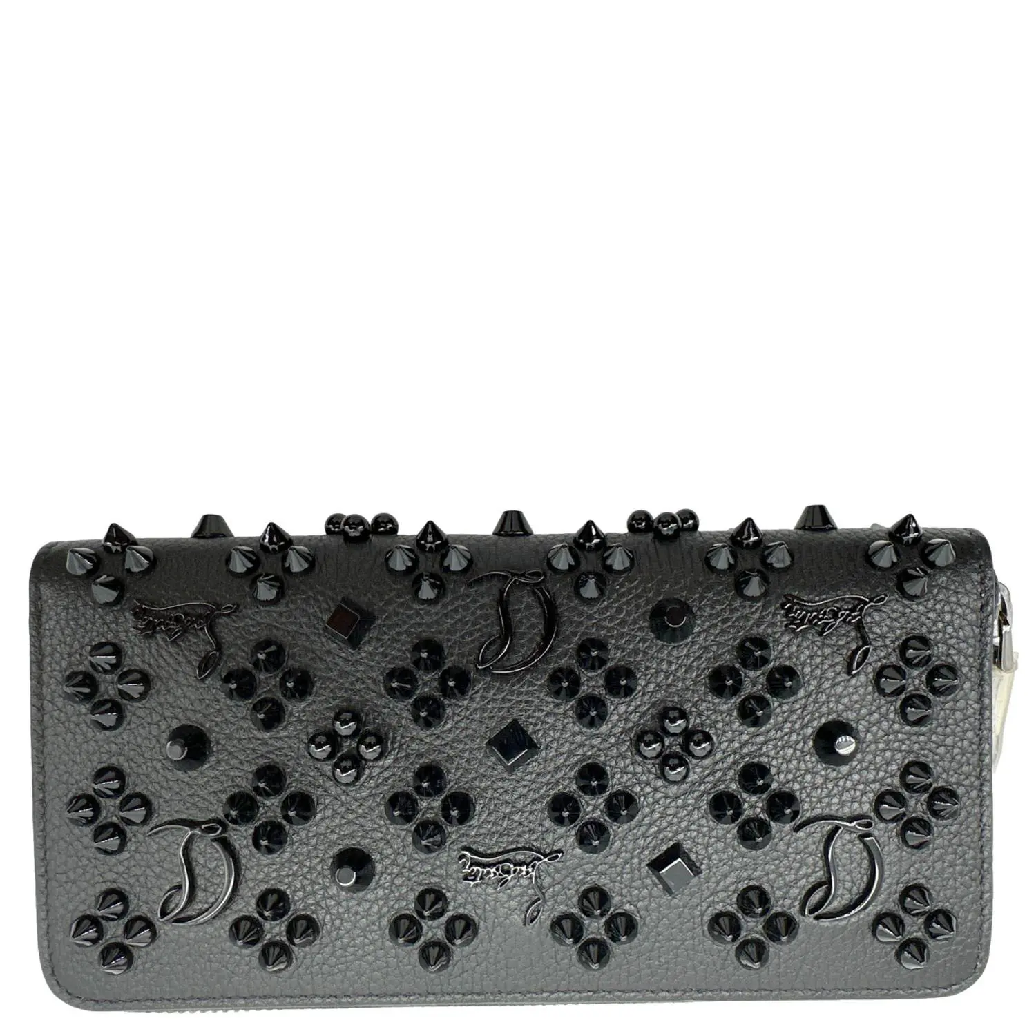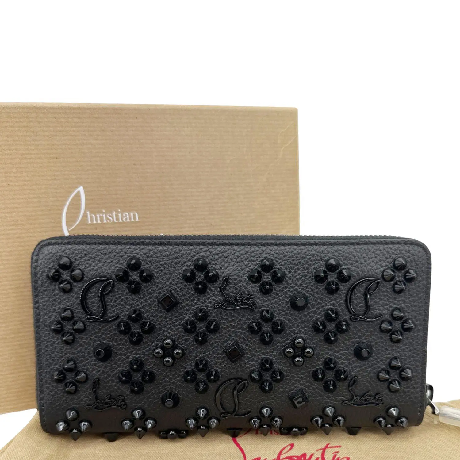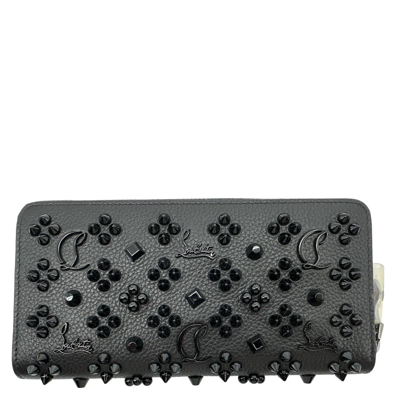 Christian Louboutin Panettone zip-around wallet in black calf leather features signature spike embellishments for a bold, edgy look. Spacious interior with multiple card slots and compartments makes it both stylish and practical for everyday use.