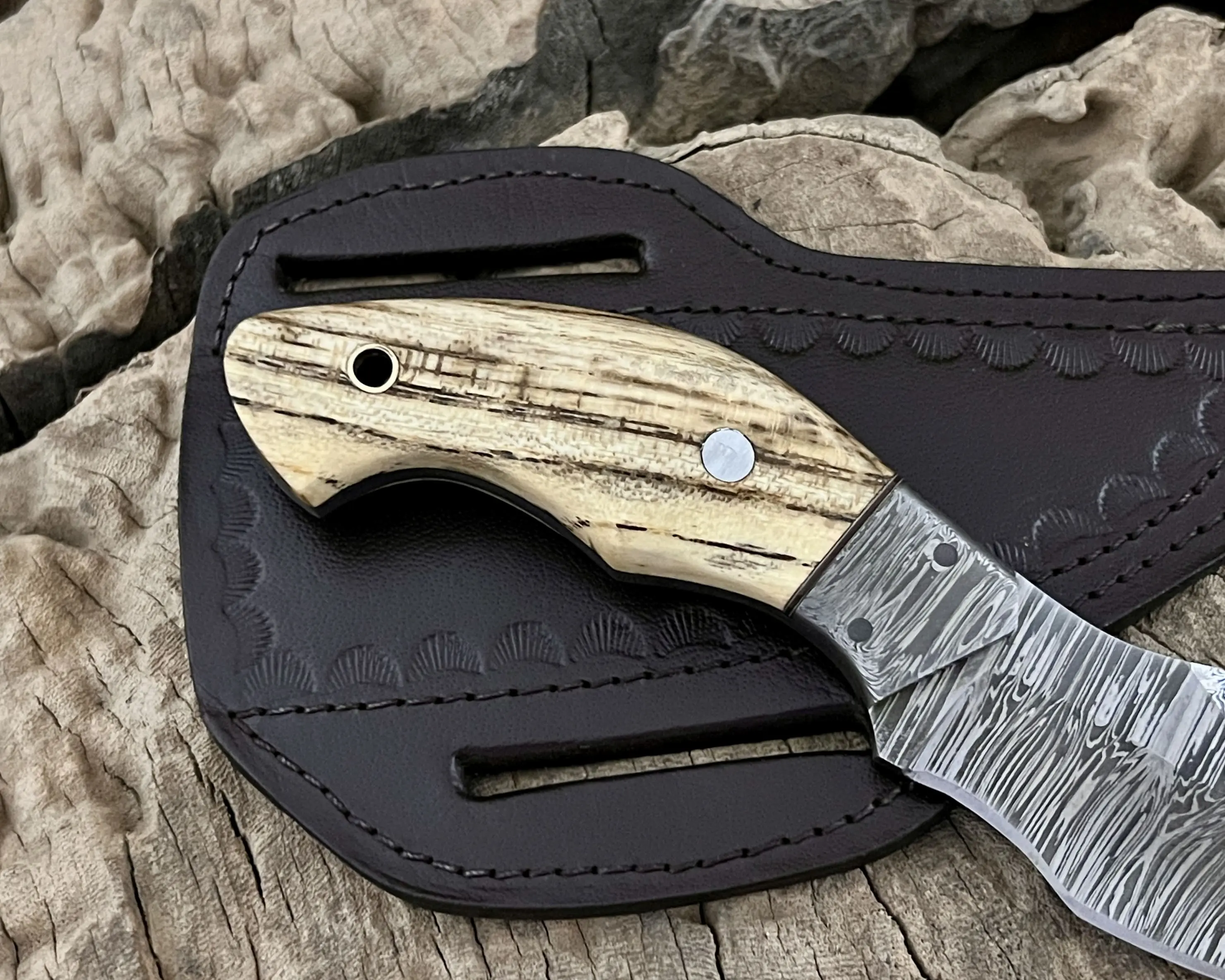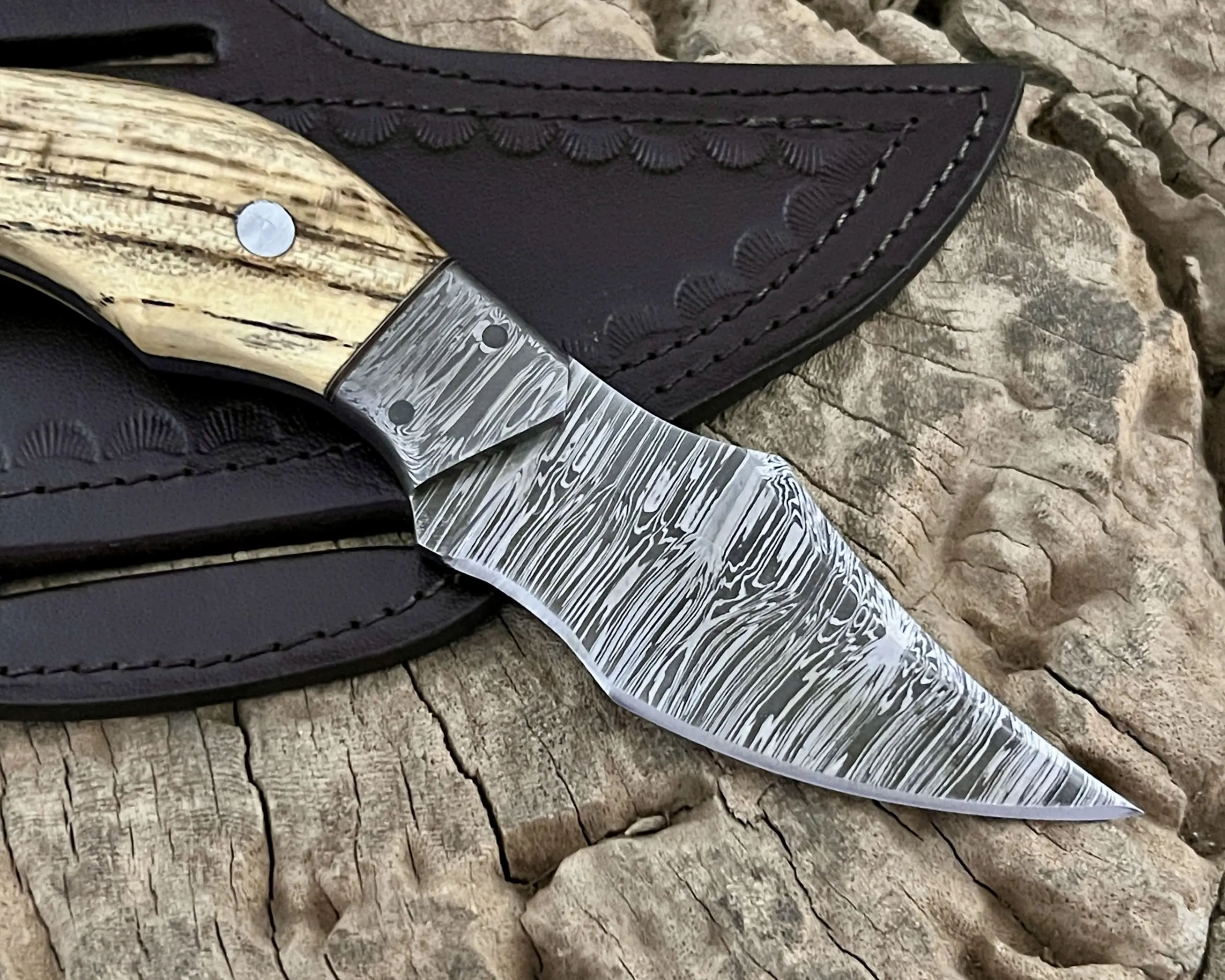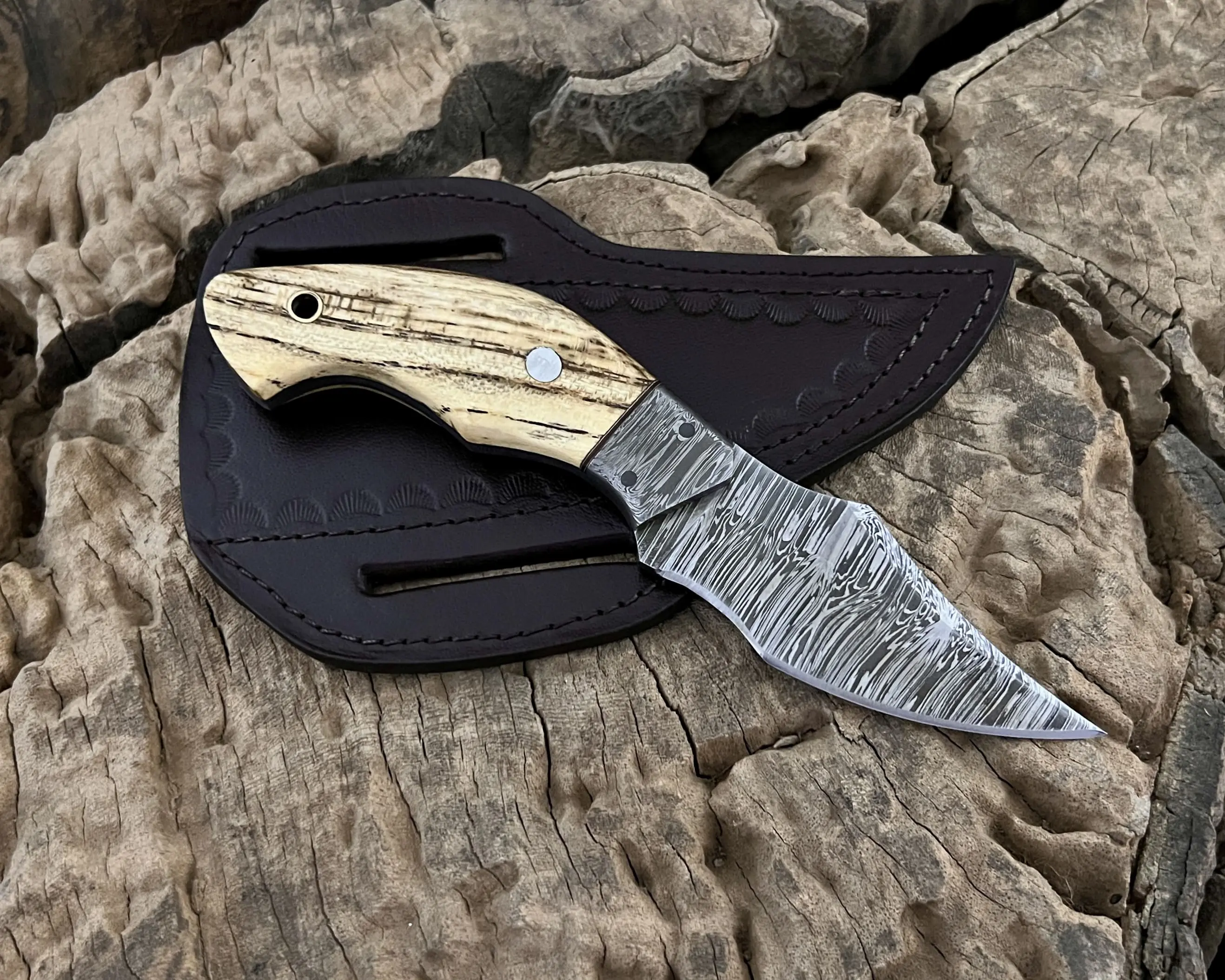 Experience true craftsmanship with this hand-forged Damascus steel knife, designed for hunters, campers, and outdoor enthusiasts. Each piece is a unique blend of functionality, durability, and artistry, making it not only a reliable tool but also a collectible showpiece.