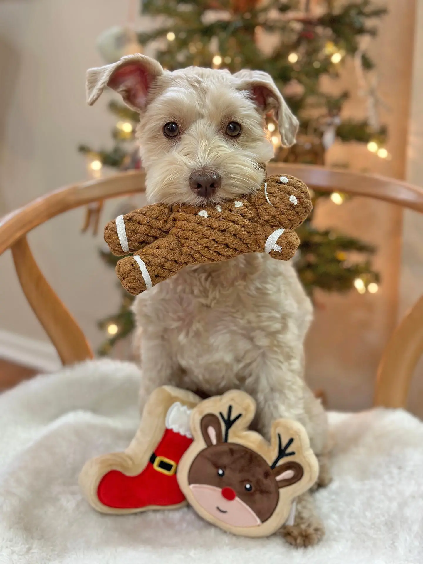 Midlee Gingerbread Man Rope Dog Toy is the perfect festive toy to have around for Christmas! Made of premium cotton, this to is safe for your pet's teeth and will not harm their gums. Chewing on rope naturally cleans your pet's teeth of tartar and plaque that has built up. We know your dog's dental health is a priority, and this rope toy will kelp to maintain good health. These toys are great for all sizes of dogs. This Gingerbread Man Rope Dog Toy will keep your old pup entertained or your young teething pup from chewing on your couch!