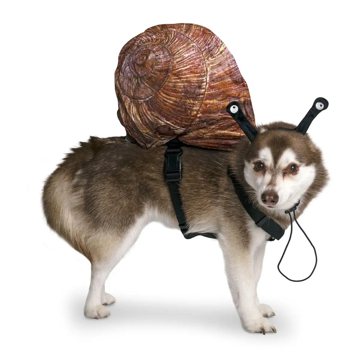 Brown and black snail dog Halloween costume. Best for medium to large-sized dogs. Includes snail eyes headband that stretches from 4" to 8" in diameter and includes an adjustable chin strap. The snail's shell is multicolored with oranges and brown tones and it sits nicely on the pet's back with an adjustable harness. D-ring is attached for easy trick-or-treating with a leash! The harness expands to a 22" chest and 30" back. Your dog will look like an adorable snail when they are wearing this hilarious costume!