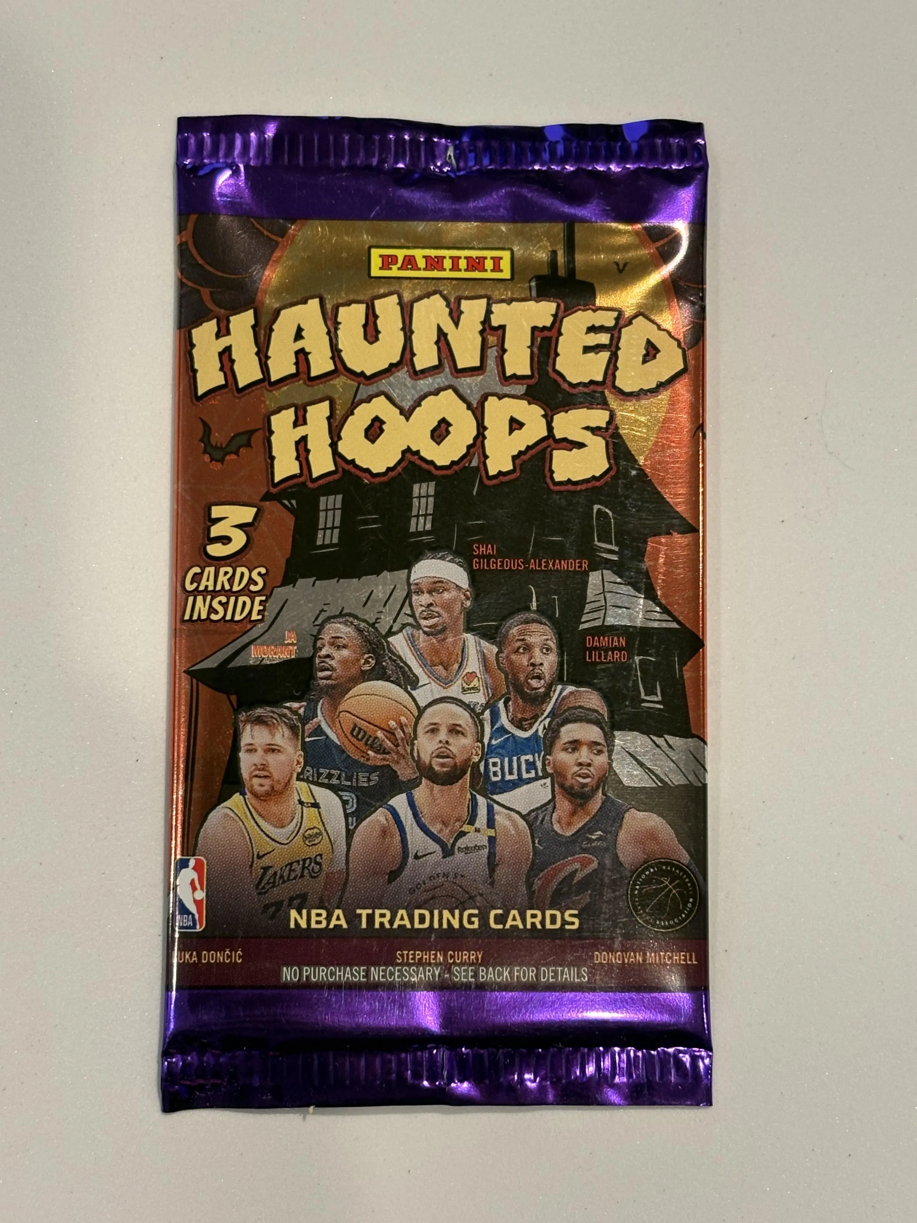2024-2025 Panini Haunted Hoops Pack of 3 cards. Panini haunted Hoops basketball features a 300-card set including 280 base haunted hoops and 20 base haunted hoops tribute cards.