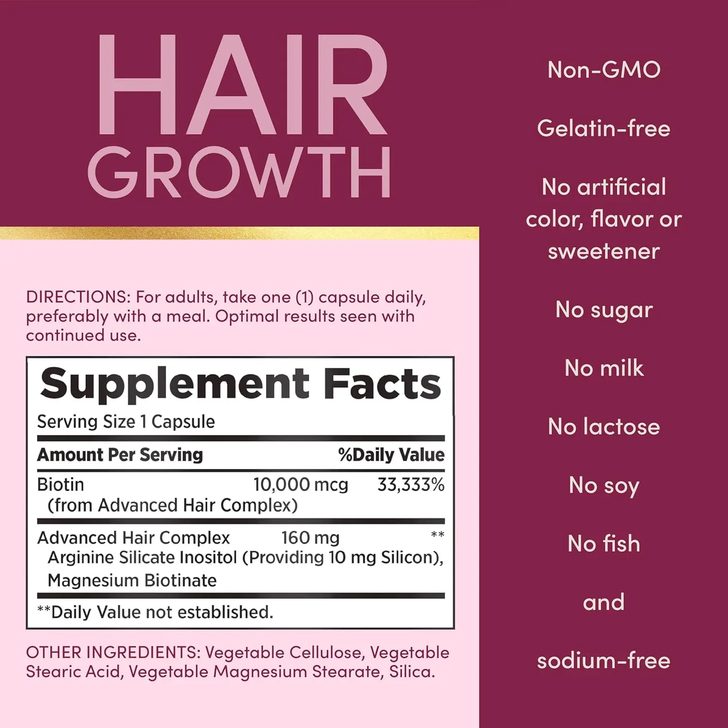 ·From the number one brand for Hair, Skin and Nails (2), Nature's Bounty Optimal Solutions Hair Growth offers a unique hair growth product for women, providing a scientifically-backed solution for thicker, fuller hair.(1) This advanced formula contains key nutrients like Biotin, Silicon, and Arginine, essential components for hair growth.(1) Our product, revered for its quality, delivers hair growth vitamins for women in a convenient, one-per-day capsule that fits seamlessly into your routine.(1) Formulated to nourish hair follicles, Nature’s Bounty Hair Growth supports existing hair growth and help increase thickness within just three months.(1) Additionally, with the inclusion of biotin, Nature's Bounty Hair Growth helps support your hair care regimen.(1) With our 50 years of dedication to wellness and nutrition, you can trust Nature's Bounty for effective hair supporting supplements.(1) Our product is non-GMO, gelatin-free, and vegetarian. Available in a one-month supply with 30 capsules, these Arginine, Silicon, and Biotin vitamins are crafted for those aspiring to enhance their hair.(1) Elevate your hair regimen with Nature's Bounty, your trusted ally in hair supplements.