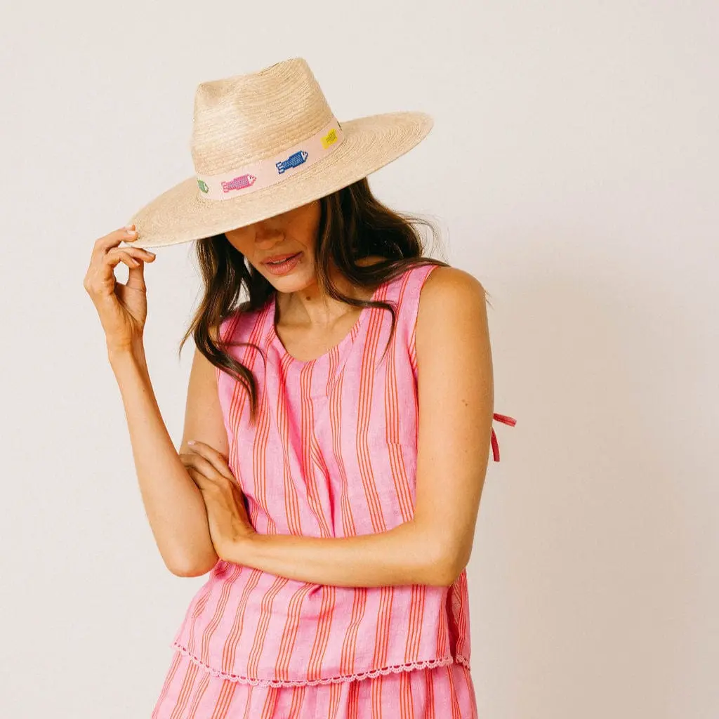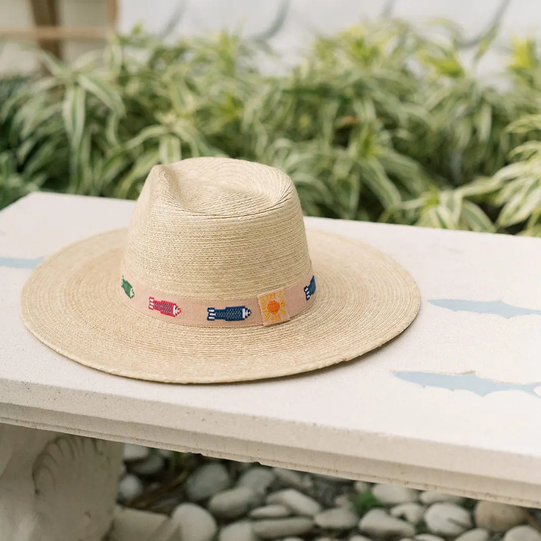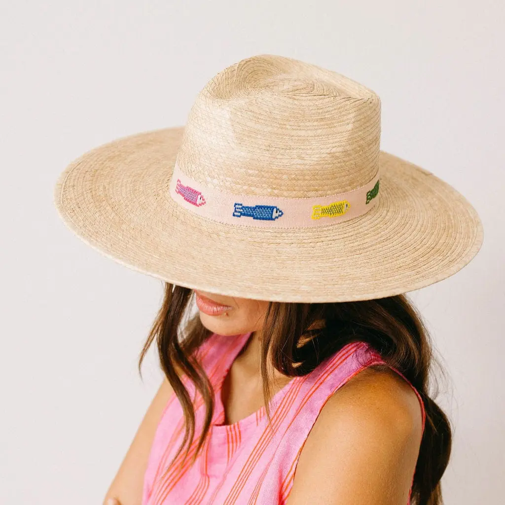 The Colorful Fin Palm Hat features a blush cotton band with assorted colorful embroidered fish and is a part of our sustainable, fair trade hat collection and graded at the highest UPF rating.