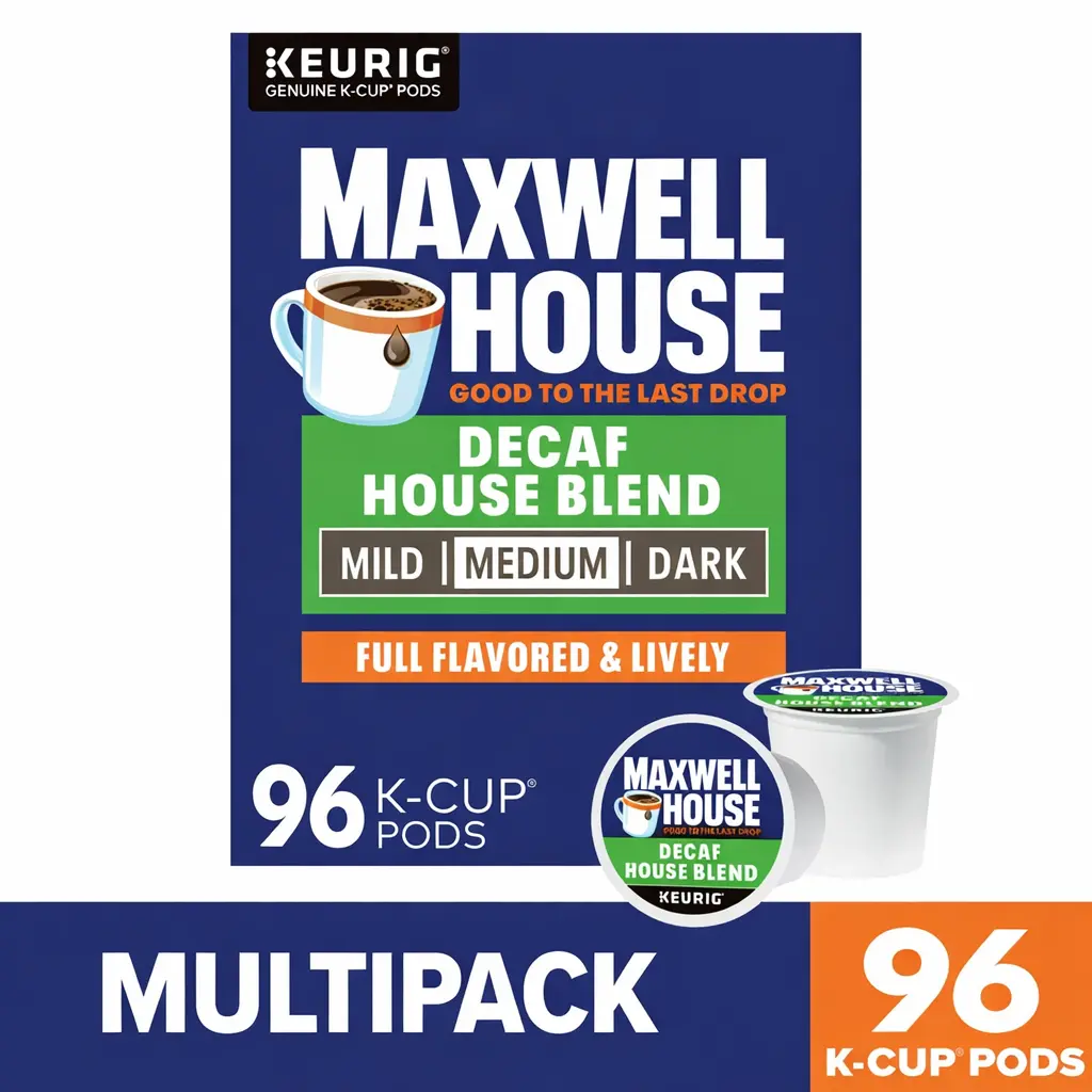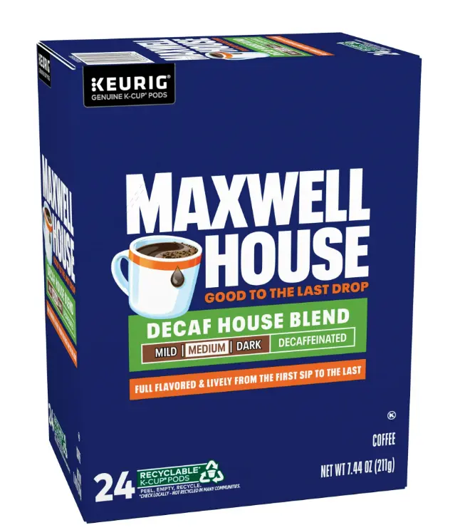 Maxwell House House Blend Decaf in convenient K‑Cup pods. This medium‑roast decaffeinated coffee delivers a rich aroma and full‑bodied flavor without the caffeine, making it perfect for any time of day. Each pod brews a consistently great cup that’s lively from the first sip to the last.