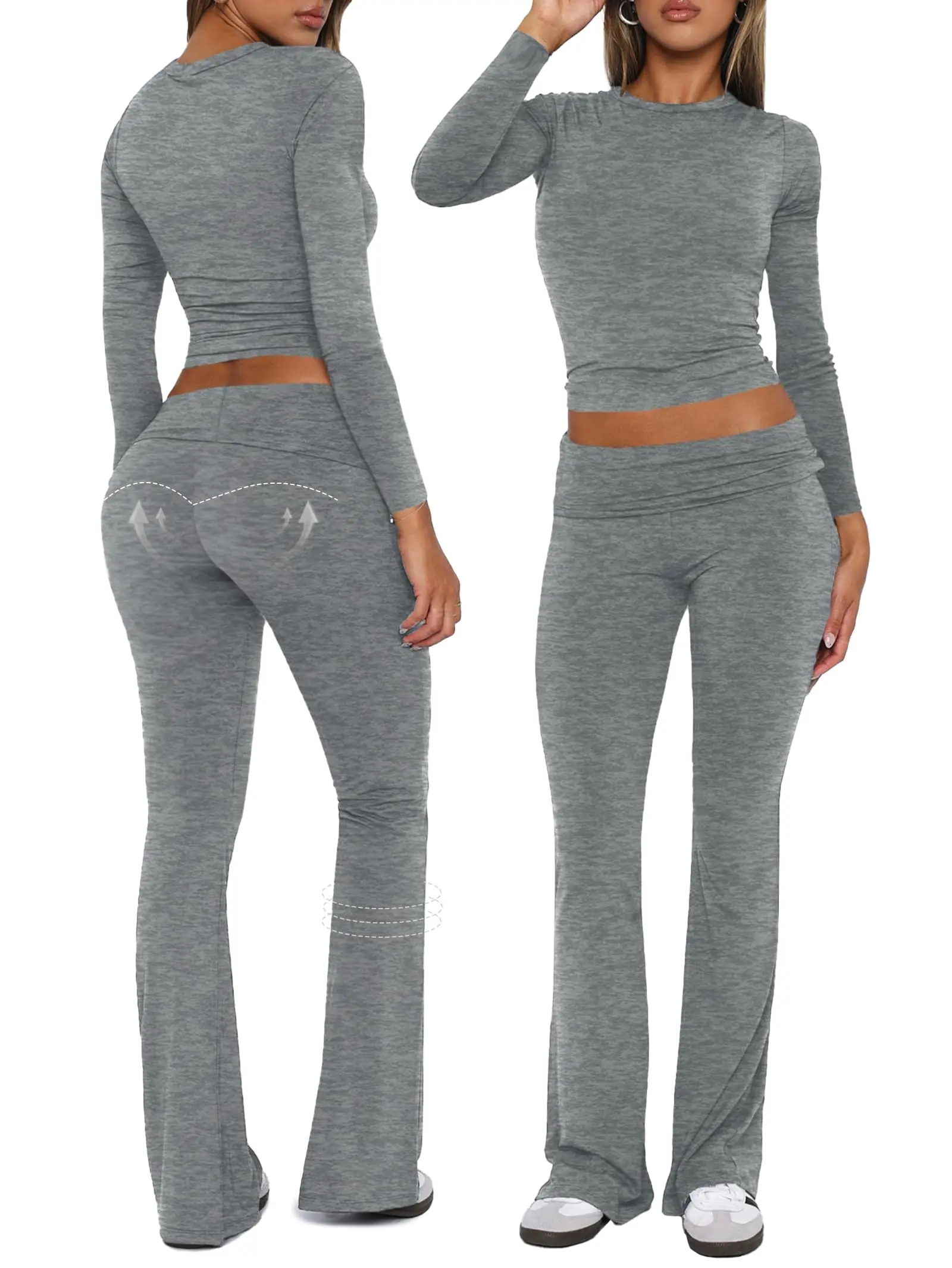 [Fabric: Workout Two Piece Fold over pants set is made of soft and elastic high-quality ribbed knit to ensure comfort. It’s easy to care for allowing you to enjoy its comfort for many occasions to come Design: Round neck cropped length bodycon low rise and slight flare. The fold over flare leggings sets are designed to accentuate your curves while providing ultimate comfort Eye-Catching Fold-Over Design: This soft smooth and stretchy fold over pant features a throwback-inspired flare with a fold-over waistband which can be adjusted to be low-rise or mid-rise to create a ruched look lightweight soot colorway provides more coverage "All-Day Comfort: Whether youre practicing yoga lounging at home or stepping out for casual engagements our outfits provide comfort that lasts all day" Notice:Before order fold over flare pants set Lounge Outfits please carefully read the Size Chart we provided in the pictures (Not Amazon size chart)]