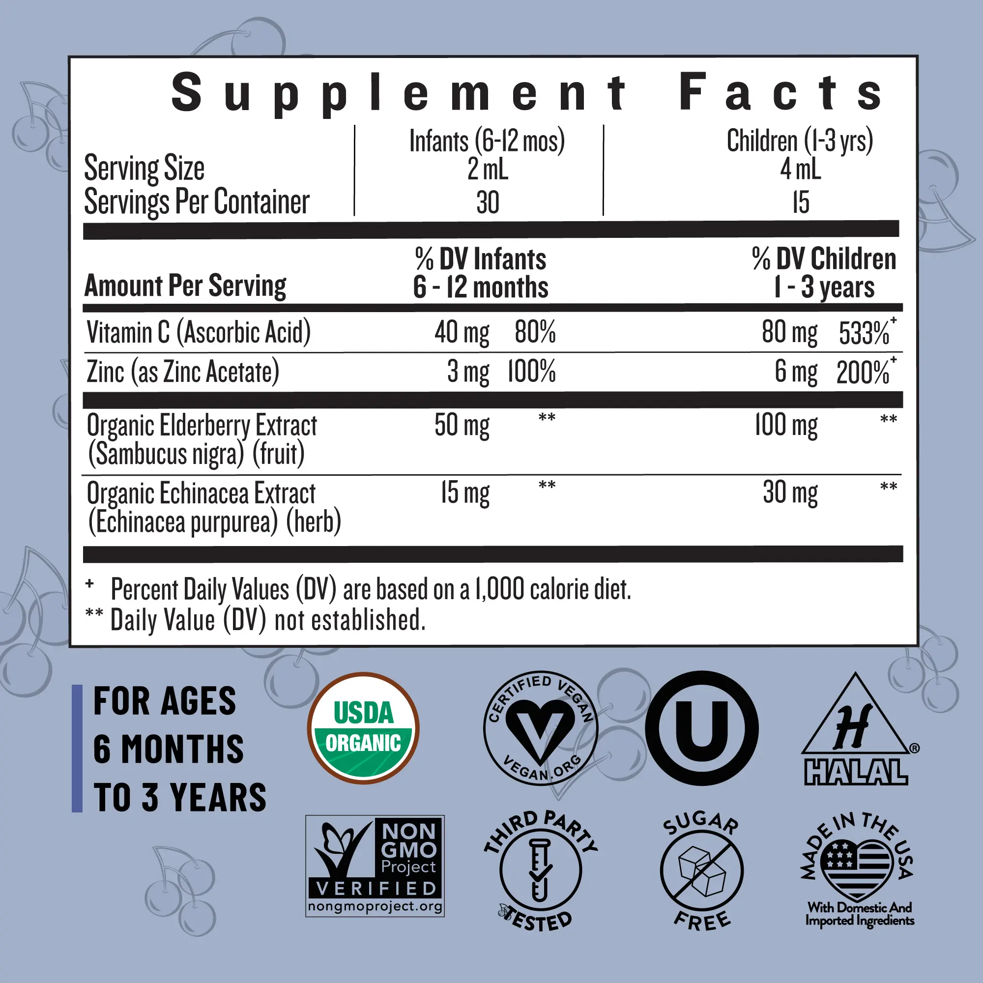 Formulated with Elderberry, Vitamin C, Zinc, and Echinacea for immune support for ages 6+ months, because tiny humans need big protection!*