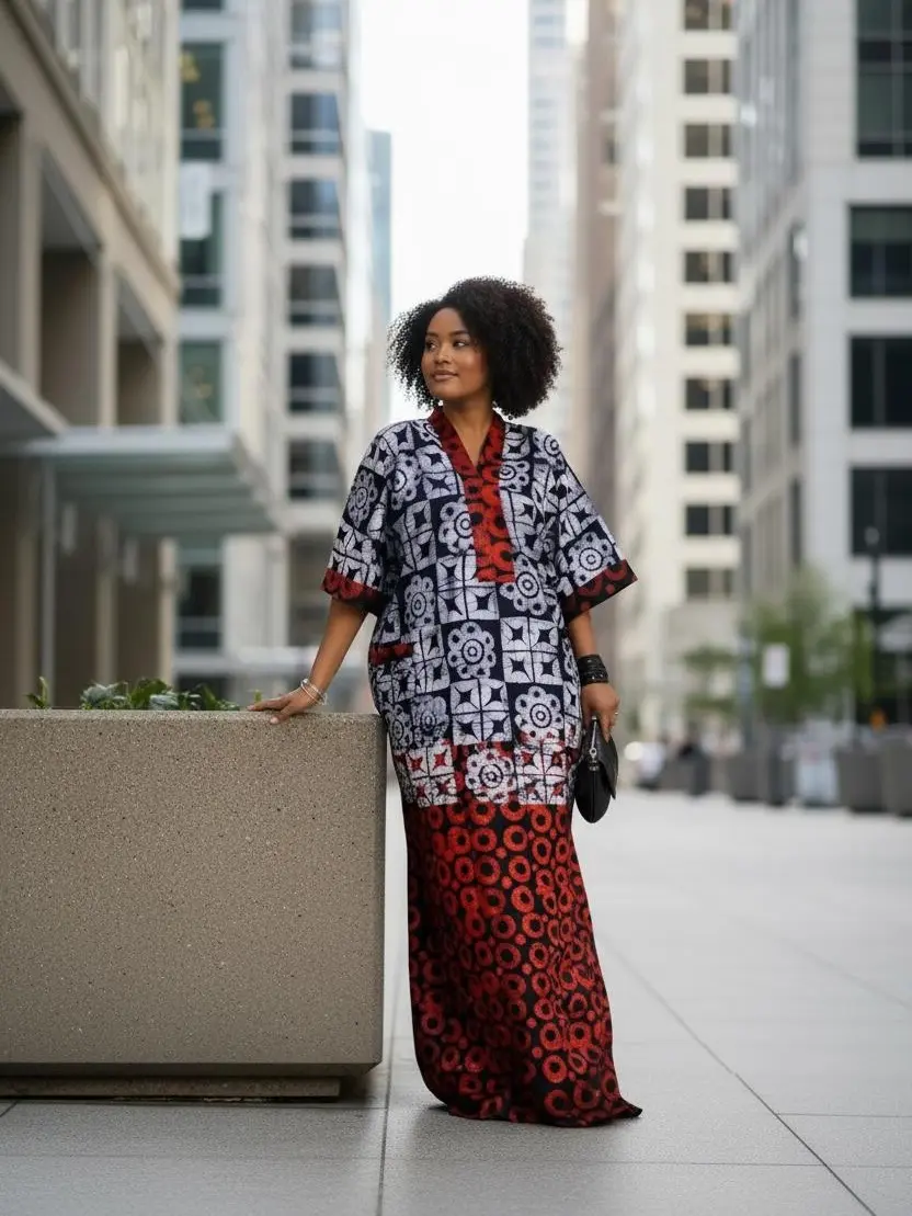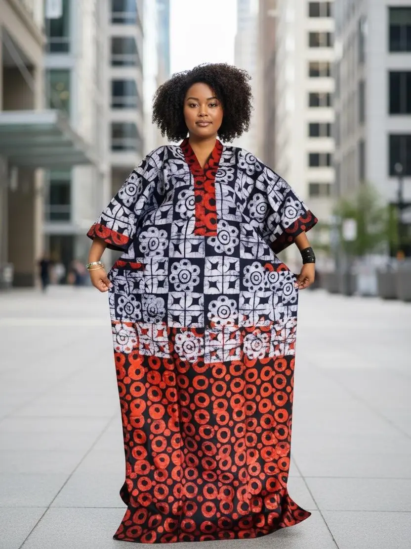 Experience authentic African elegance with our Heritage Batik Kaftan Maxi. This stunning dress features a bold, hand-dyed geometric batik print that celebrates traditional artistry. Designed for oversized comfort with a flattering V-neck silhouette, it is perfect for summer vacations, cultural events, or effortless city style.