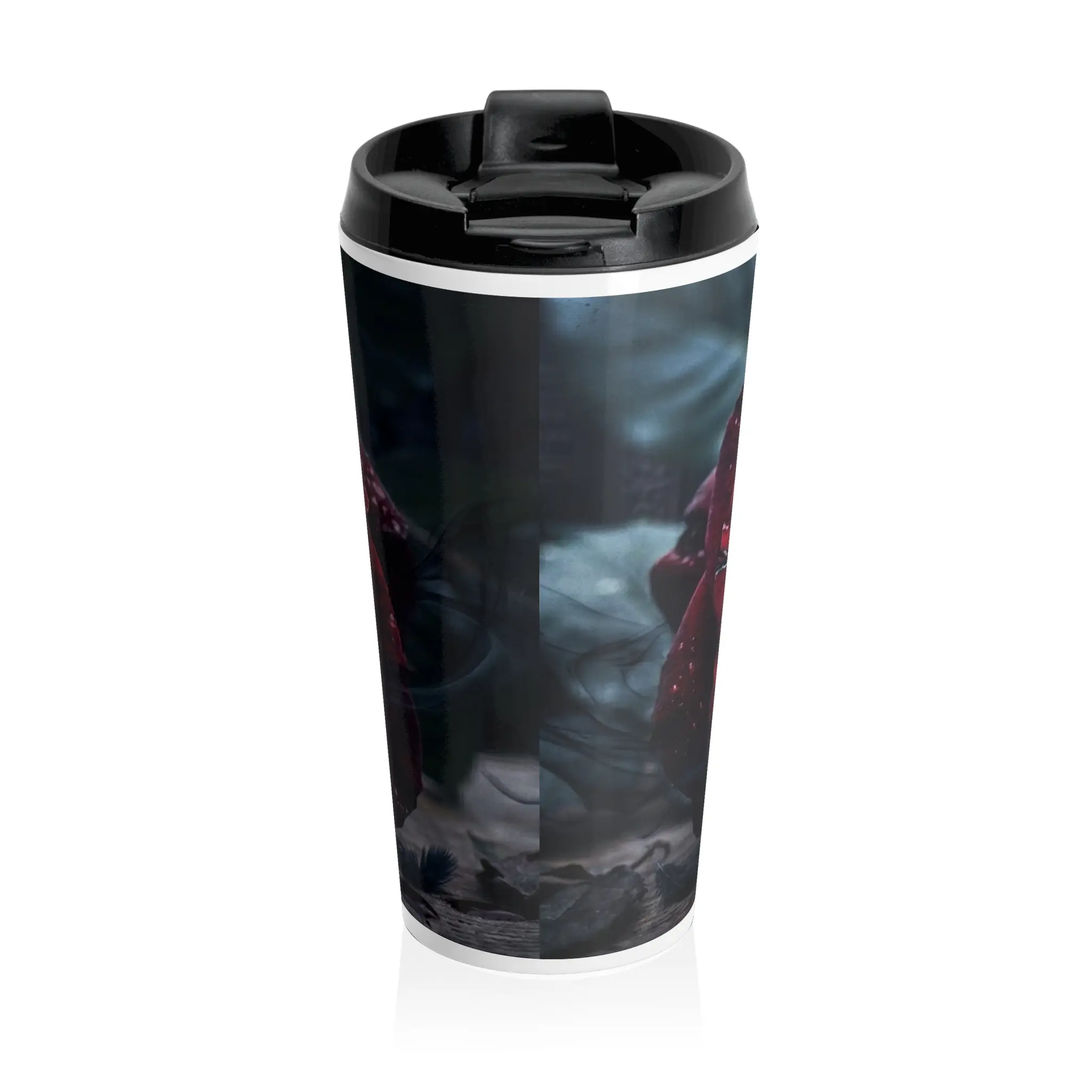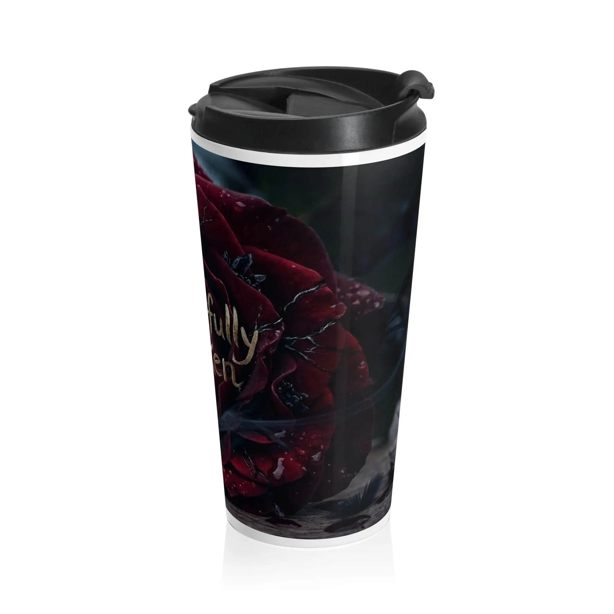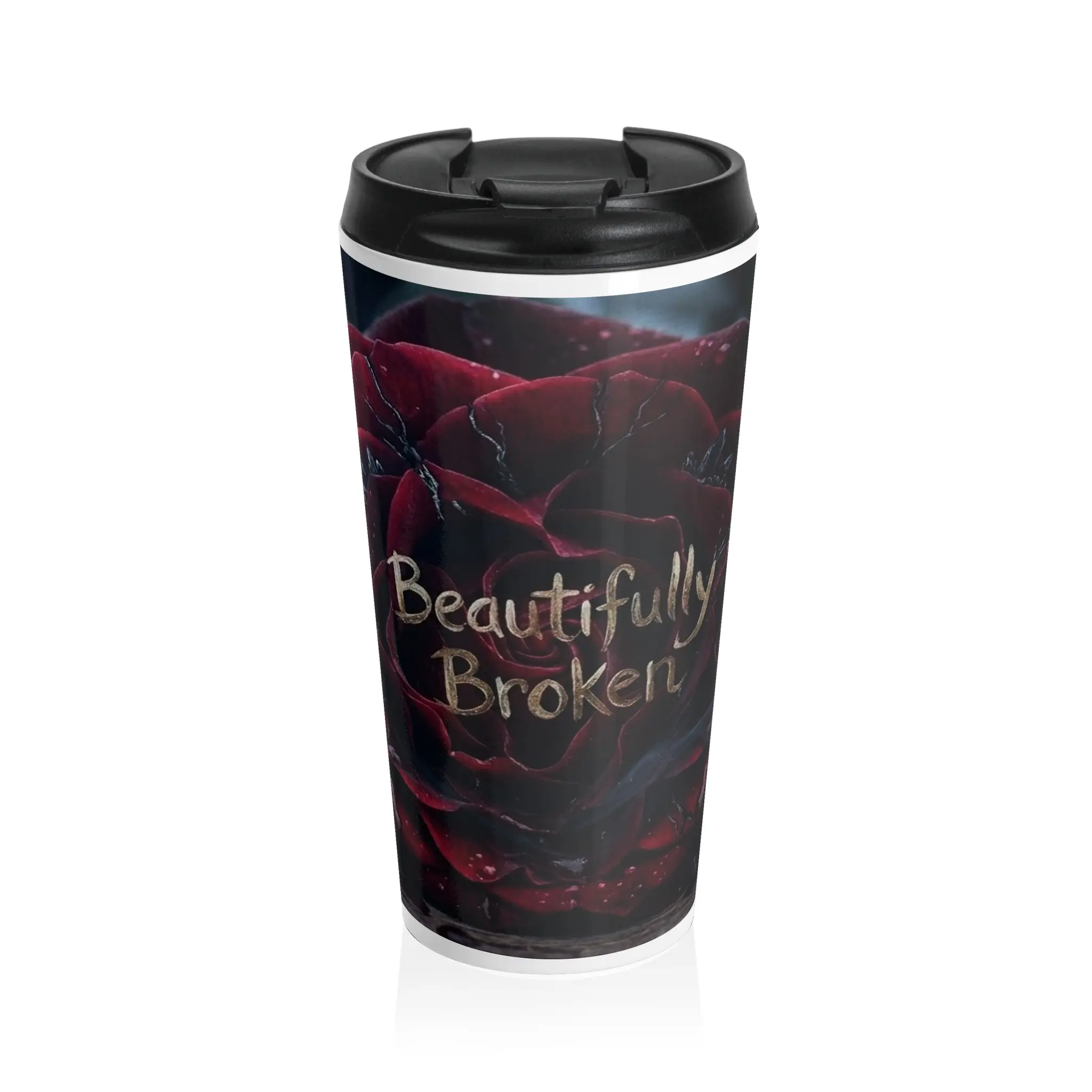This travel mug wraps a quiet, moody story around your hands. Deep crimson rose petals and the handwritten phrase “Beautifully Broken” sit against a shadowed, rainy backdrop — a design for anyone who finds beauty in scars and stillness. The 15oz stainless steel body keeps drinks hot or cold while the leak-resistant, BPA-free flip lid makes commuting or late-night drives less fussy. Rounded edges and a slim, tapered shape fit most cup holders and feel comfortable to hold. Bring a little reflective, poetic energy to your morning ritual or carry a steady companion on long creative nights.