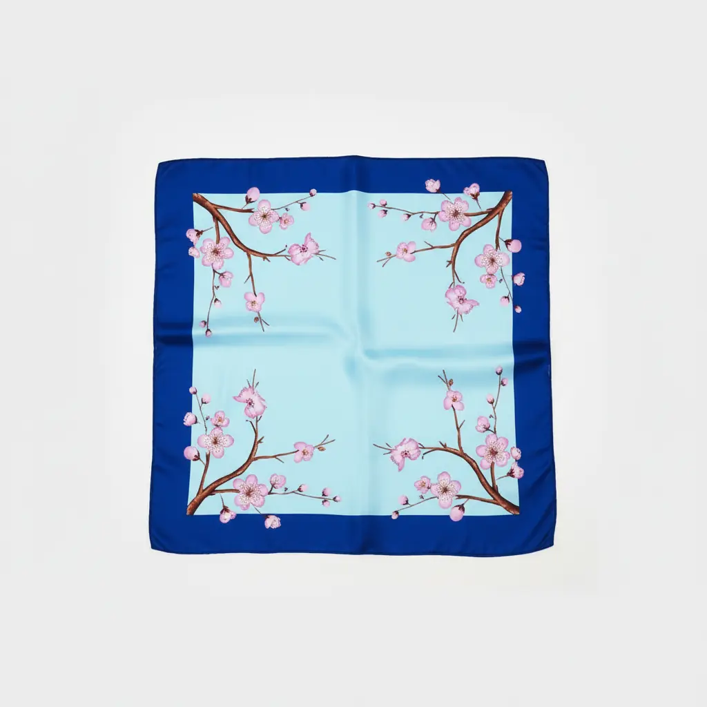 Discover refined elegance with The Blossom Scarf, where delicate cherry blossoms meet sophisticated style. This exquisite 90cm square (35.4in square) satin scarf features a serene sky-blue center adorned with graceful pink cherry blossoms and rich navy borders, creating a harmonious blend of tranquility and polish. Crafted from premium satin, this versatile accessory effortlessly transitions from professional office settings to your nighttime hair care ritual. Whether you're adding a touch of botanical beauty to your work attire or protecting your hair while you sleep, The Blossom Scarf delivers both refined sophistication and practical luxury in one stunning piece. (Patterns may vary slightly from what's shown.)
