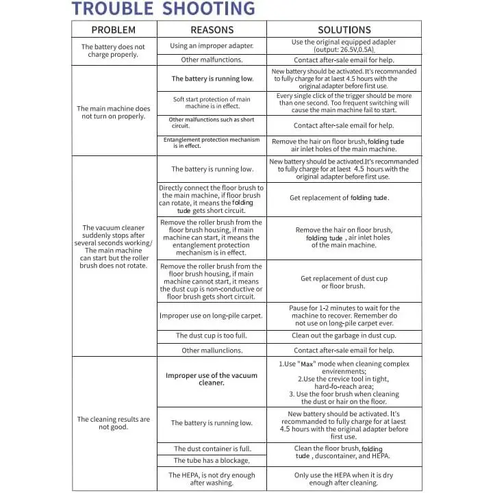 ·IMPORTANT NOTE: For optimal charging and to protect your battery, always use the original adapter (with "KP1108 Vacuum" words) that came with your vaccum. If the vaccum stops working, check the floor brush and air intake for any blockages. It is recommended for use on short pile, hardwood, or tile floors. Long pile carpets may result in a runtime of less than 20 minutes which is normal. Please promptly remove any hair tangled around the brush roll to bad suction performance.