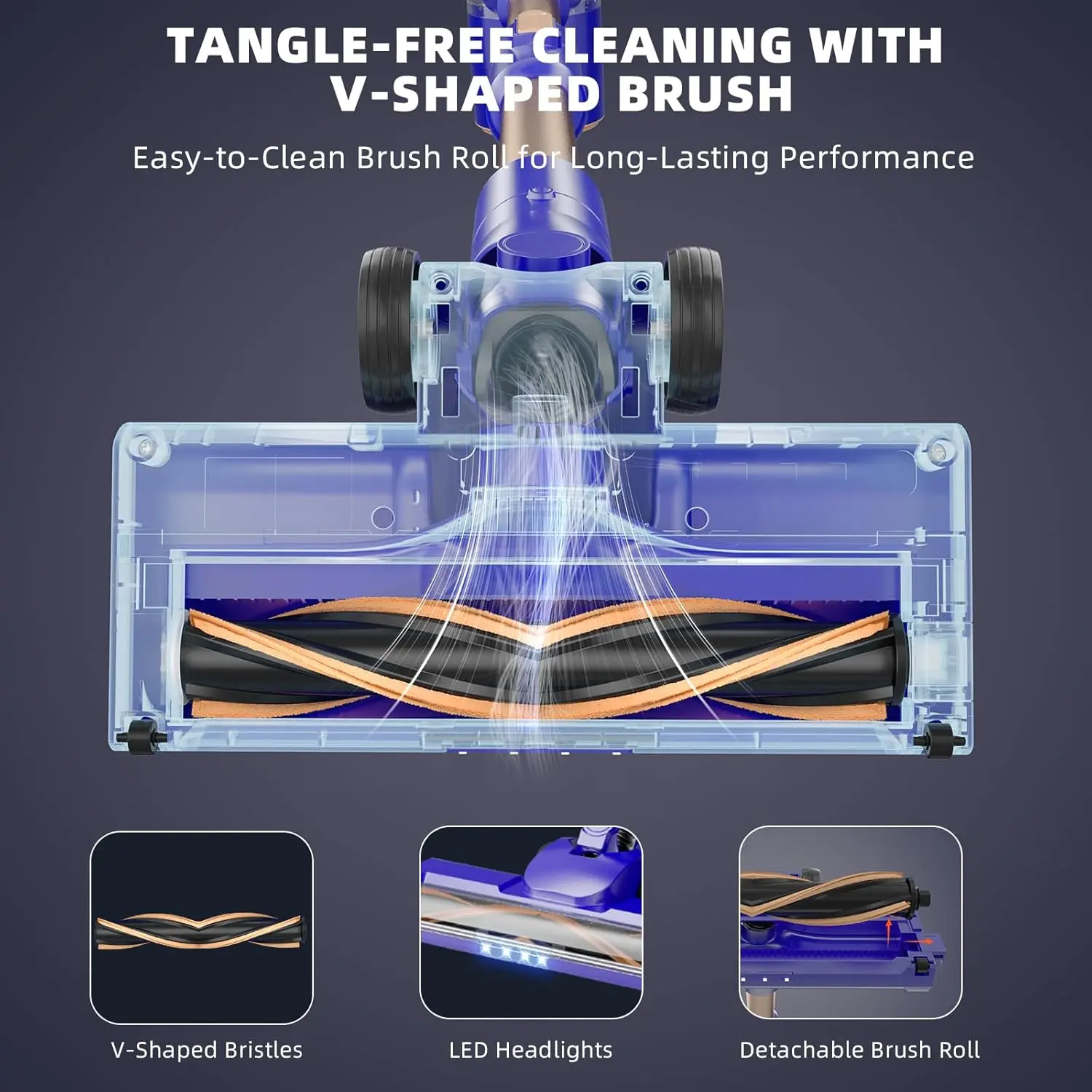 ·8-IN-1 Cleaning: This hardwood floor vacuum includes several attachments: a floor roller brush, a long crevice tool, and a 2-in-1 brush head. These tools allow you to thoroughly clean floors, short-pile carpets, beds, curtains, pet beds, and even your car. This vacuum features a built-in safety mechanism that automatically stops the main unit if the roller brush becomes tangled, preventing damage.