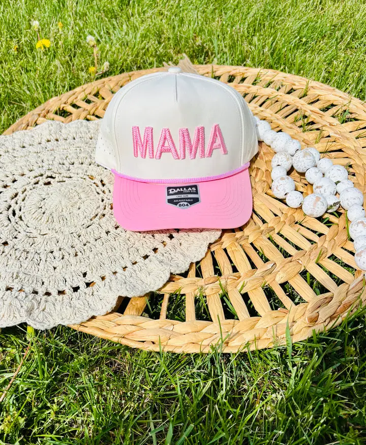 MAMA Embroidered on a white and pink rope trucker hat. MAMA embroidered in 3D cross stitch puff font!