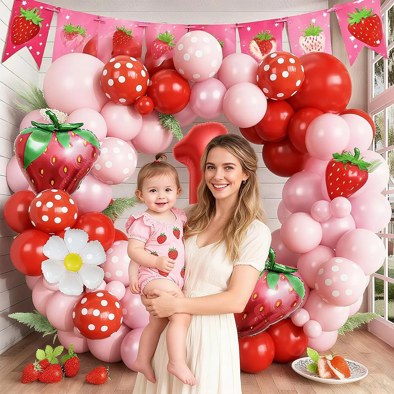 Create a sweet strawberry themed celebration with red and pink balloons for first birthdays or showers