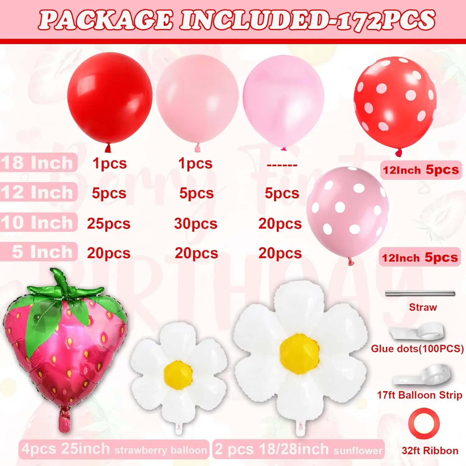 172pcs Strawberry Balloon Arch Kit with Red Pink & Foil Strawberry Daisy Balloons for Party Decor