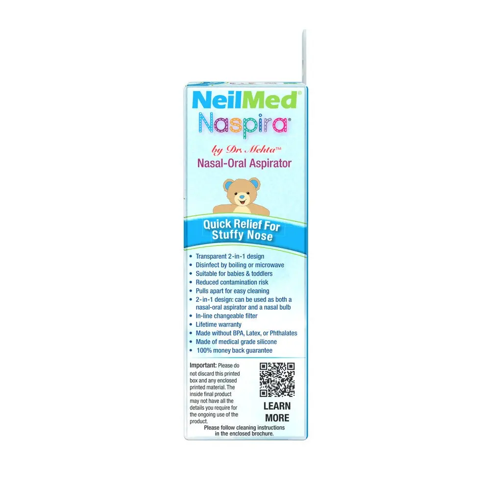 The NeilMed Naspira Nasal-Oral Aspirator is a uniquely designed system, where several important safety, quality and efficacy features are combined. With our unique 2-in-1 design, you can either use it as a NeilMed NasaBulb aspirator or as an effective Nasal-Oral suction device where parents can use suction force generated by the mouth similar to sucking through a straw. By using the NeilMed Naspira, you can quickly remove nasal mucus safely and effectively by creating a negative airflow of 5 to 10 liters or more per minute plus longer duration of suction, as opposed to simply using a bulb aspirator where the suction duration is less than half a second. In addition, the NeilMed Naspira Nasal-Oral Aspirator features in-line disposable filters to protect the parent from contact with mucus. The one-way valve prevents a large volume of accidental air from the parent's mouth from blowing into the baby's nose and prevents pushing down of the mucus.