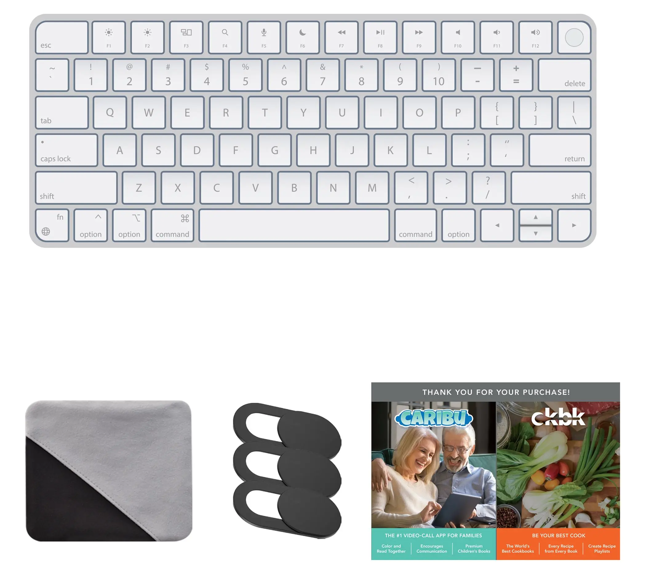 ·Includes keyboard with USB Type-C to Lightning cable, cleaning cloth, three webcam covers, and voucher