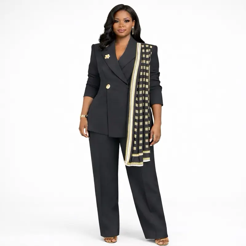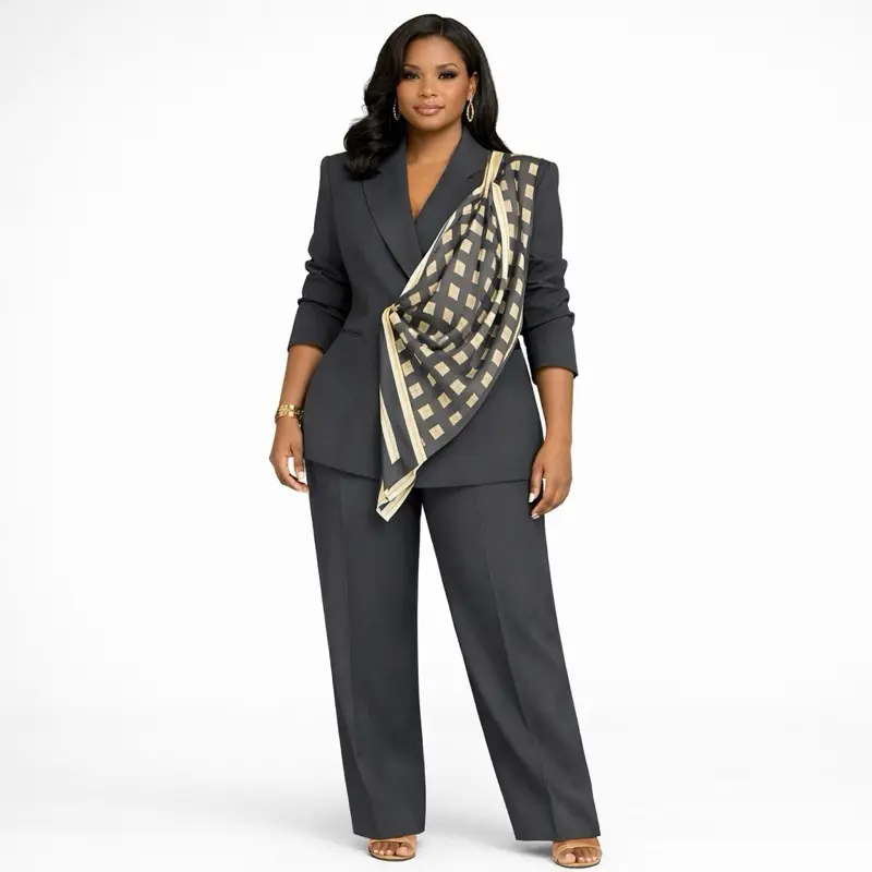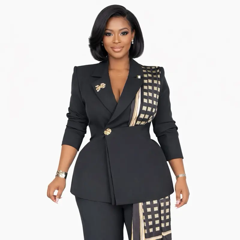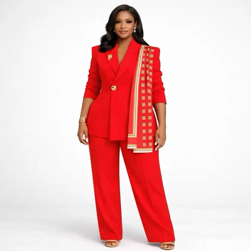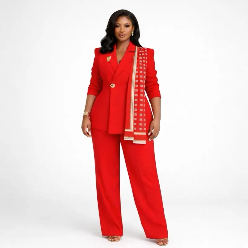 Pair the Heritage Muse Power Set with pointed heels or elegant sandals, a structured handbag, and gold jewelry for a rich, refined look. The black gives a classic luxury feel, while the red makes a bold, confident statement for standout moments.