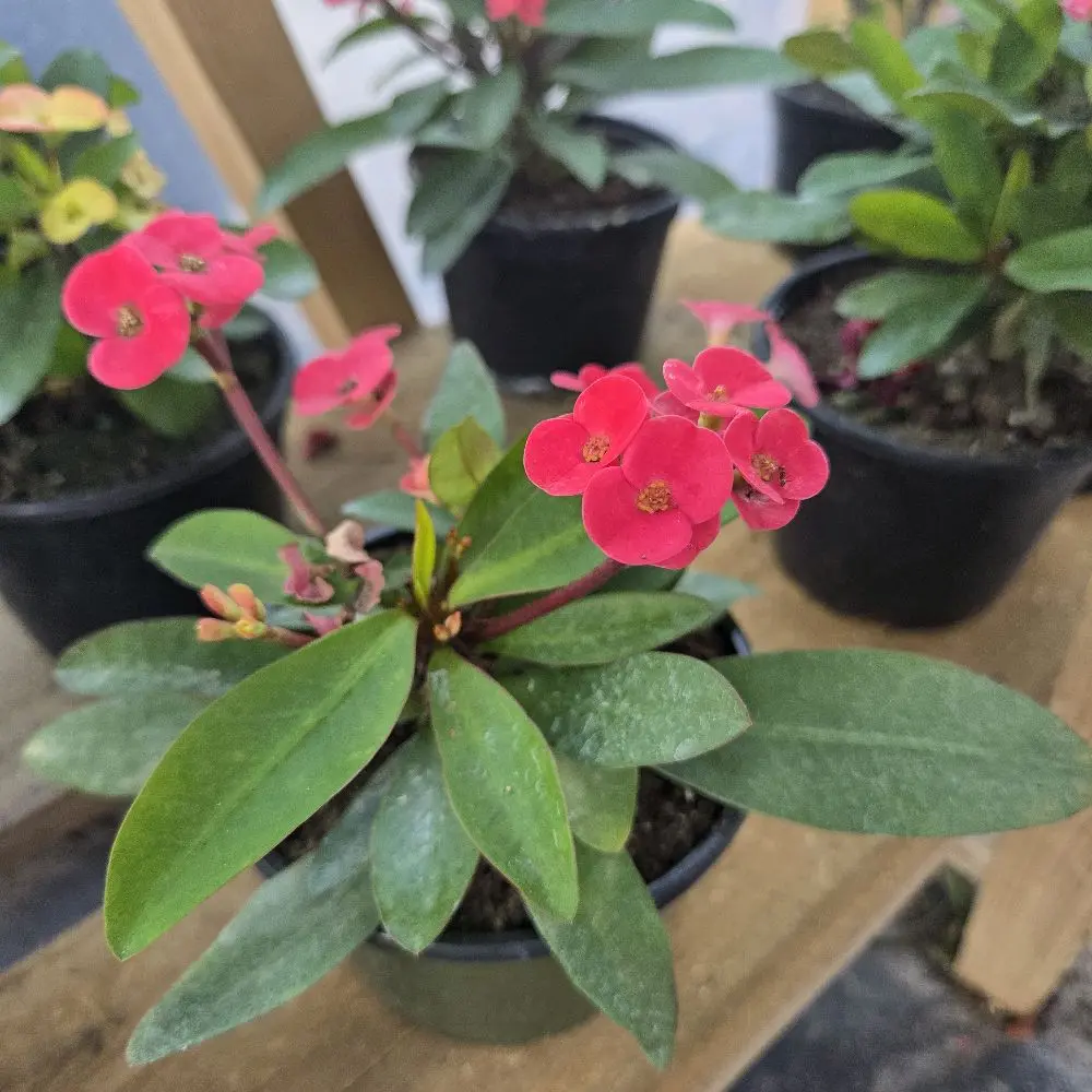 ·Title: Corona de Cristo Pink Flowers in Pot with Green Leaves for Home Decor and Gardening