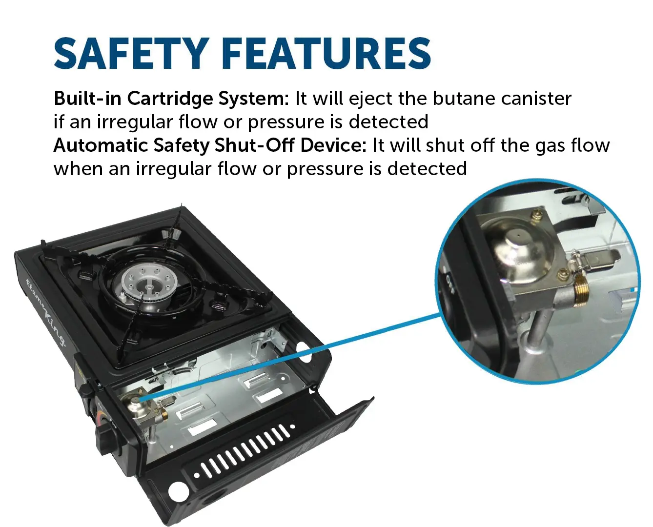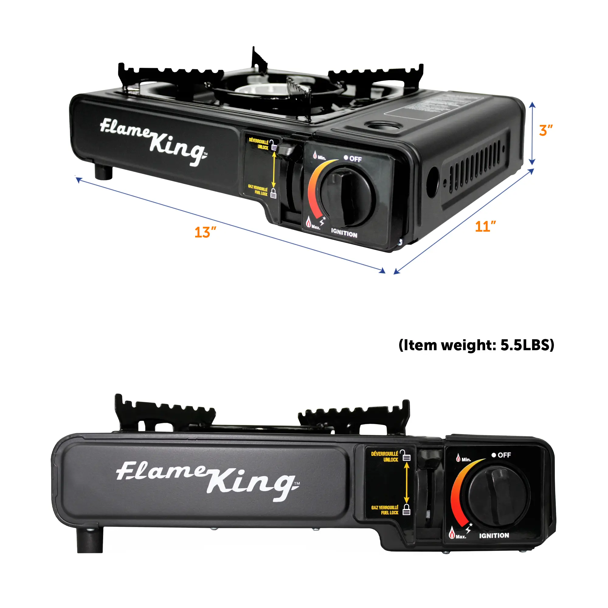 The Flame King 8,000 BTU Dual Fuel Propane Stove delivers stable, efficient outdoor cooking—ideal for backpacking, hunting, and camping. It features an 8.25" x 8.25" cooking grid with a wide, tip-resistant base that holds a 16.4 oz propane cylinder (sold separately). An adjustable control knob gives you precise heat control, while the surface accommodates pans up to 10" in diameter. For portability, the 34-inch regulator hose and base detach easily for compact storage. Matchless piezo ignition ensures quick and reliable lighting, while built-in safety systems—including a cartridge ejection system and automatic shut-off—provide peace of mind. To top it off, it comes with a durable carrying case to keep your stove protected on every adventure.