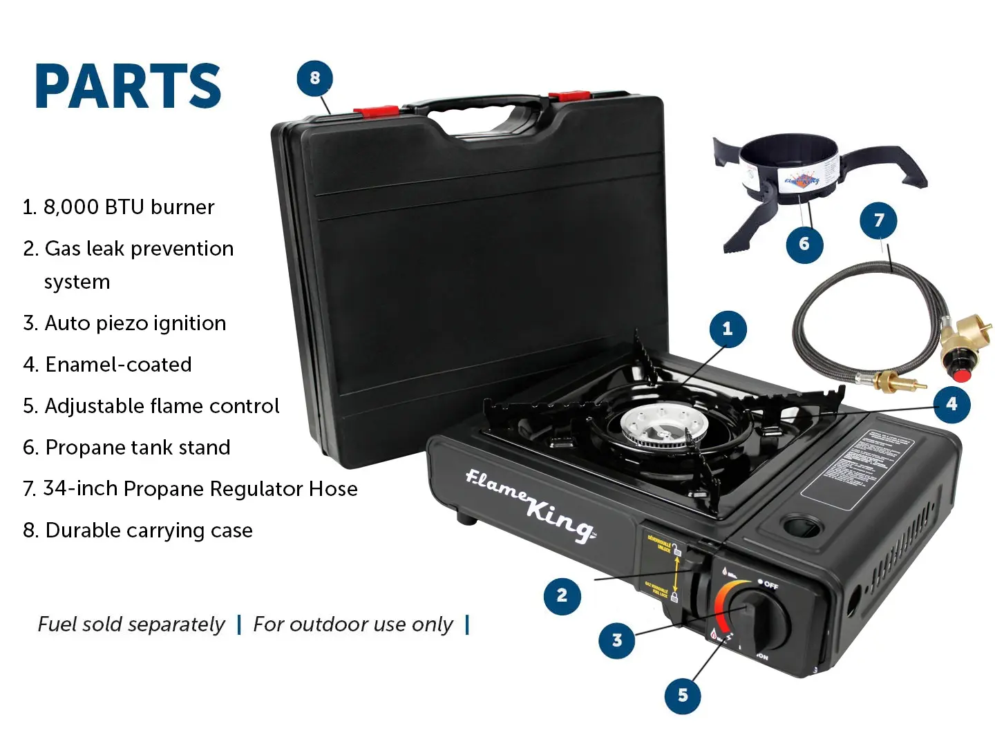 ·ITEMS INCLUDED: Camp stove, 34-inch propane regulator hose, durable carrying case, propane tank stand