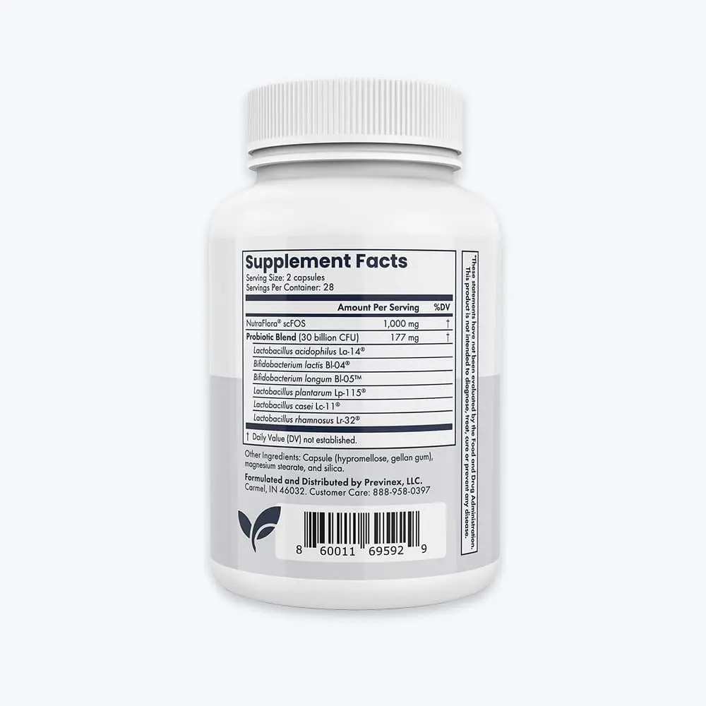 30 billion healthy bacteria, six clinically proven strains, with a clinically proven prebiotic, NutraFlora®, that helps with the growth and colonization of good bacteria in the gut. Vegan, non-GMO, shelf stable (no refrigeration required), stomach acid resistant, and oh so good for your gut!