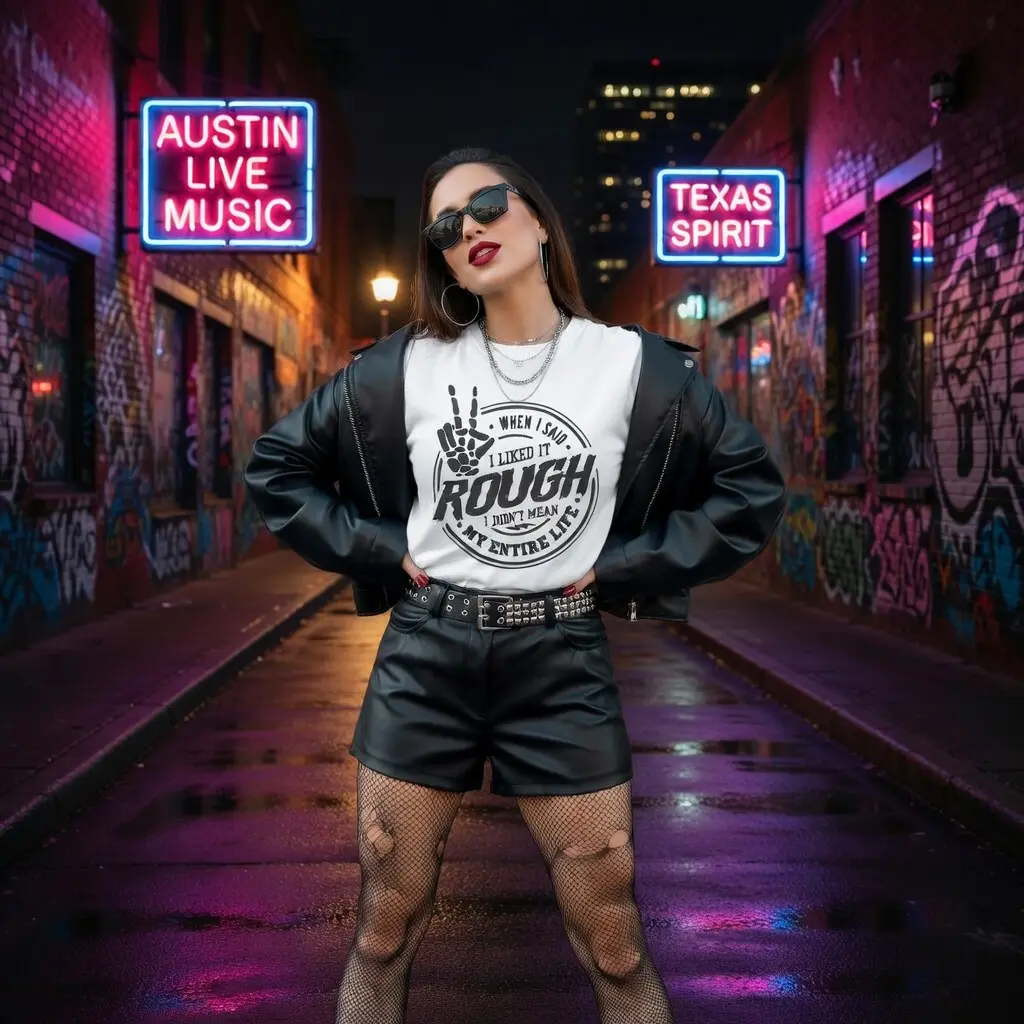 A lightweight cotton tee that speaks with a dry, rebellious grin. The bold circular graphic — a skeletal hand flashing a peace/rock sign and the tagline ‘When I said I liked it rough I didn’t mean my entire life’ — feels like inside-joke merch for people who lean into dark humor and honest sarcasm. Soft ring-spun cotton, a clean crew neckline, and a tear-away label keep the shirt comfortable and low-maintenance. Wear it to shows, motorcycle meetups, late-night hangs, or when you want your outfit to say ‘I’ve seen things, but I’m laughing about it.’