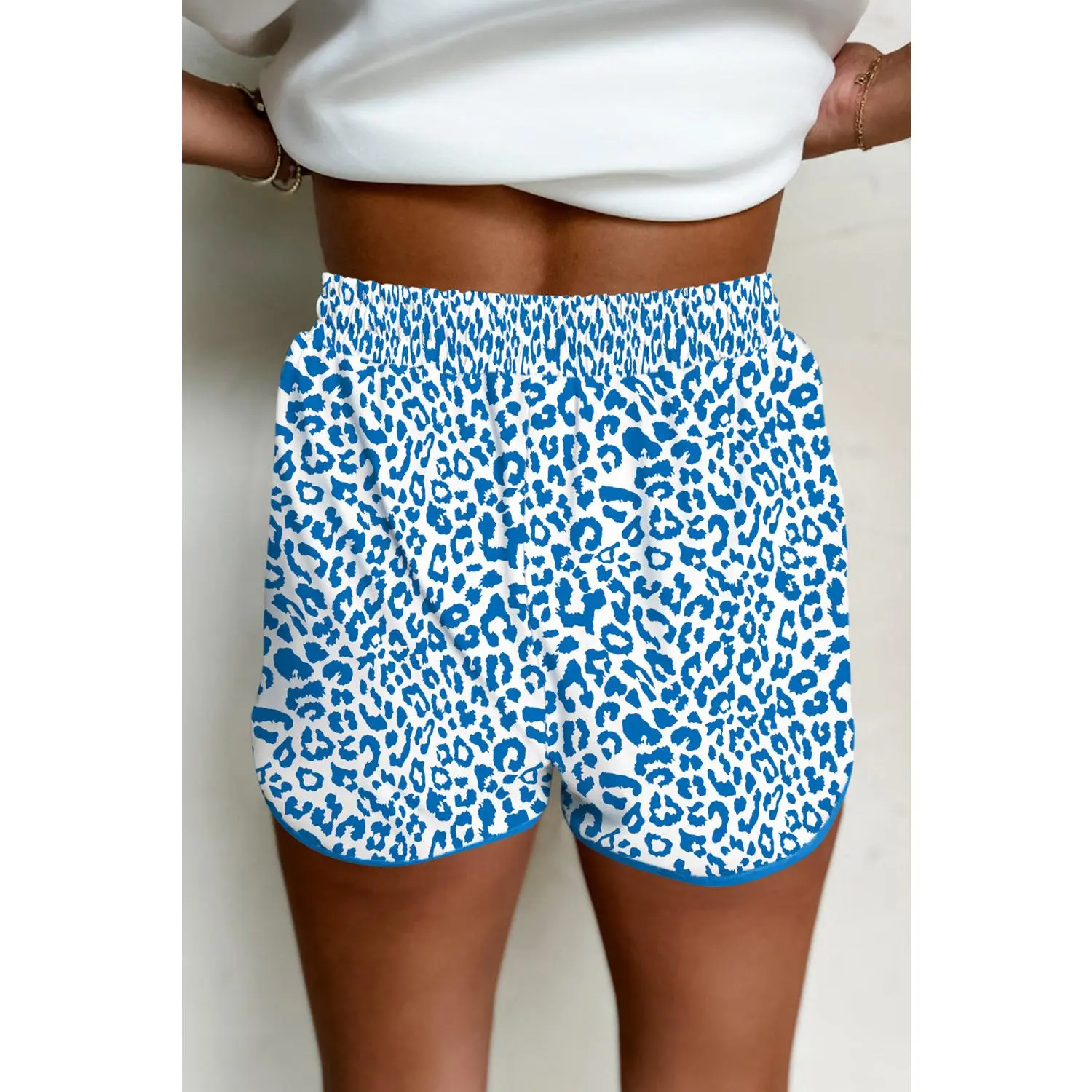 Blue Leopard Elastic Waistband Lace up Contrast Trim Casual Shorts