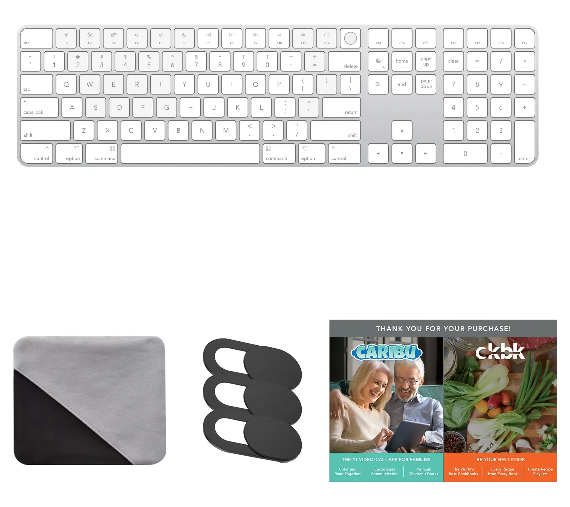 ·Includes Apple Magic keyboard with USB-C-to-Lightning cable, cleaning cloth, three webcam covers, and voucher