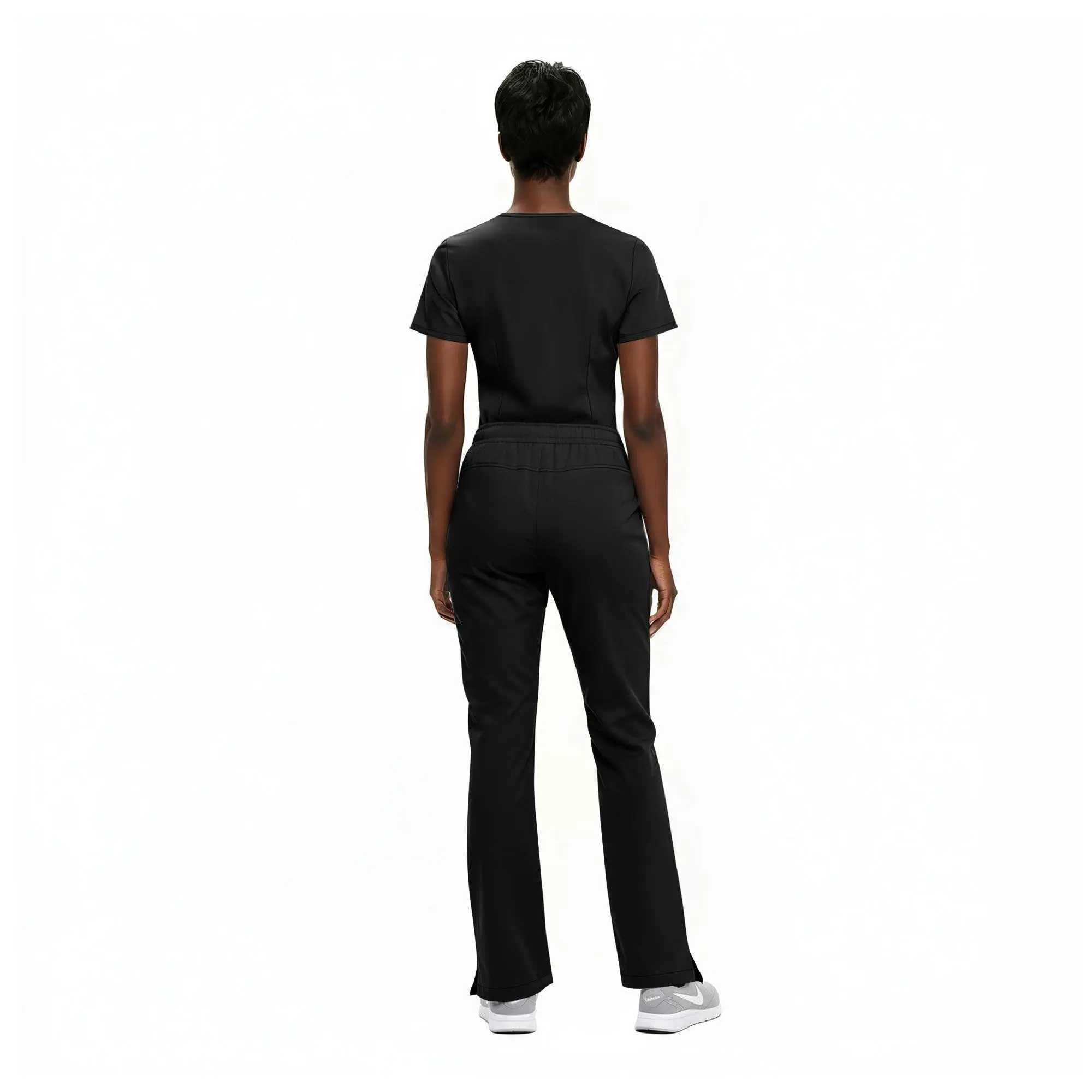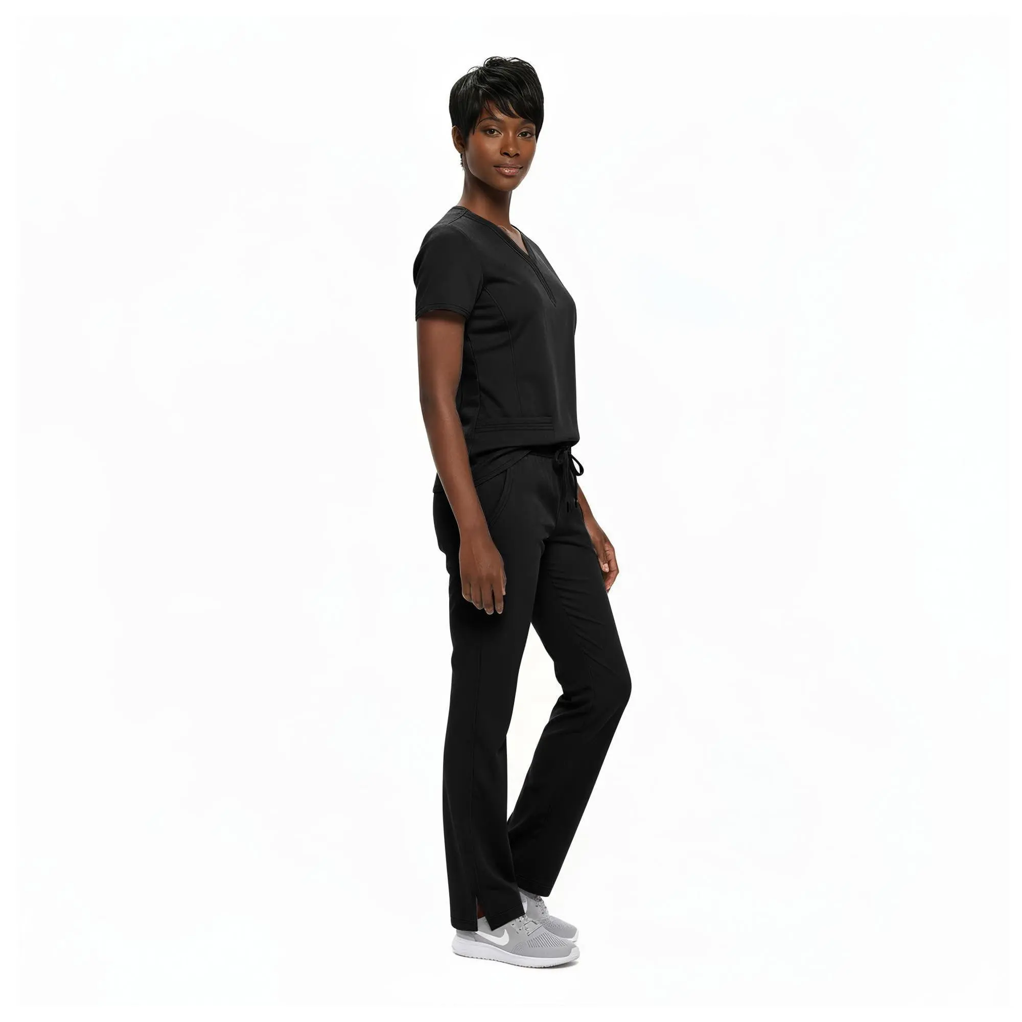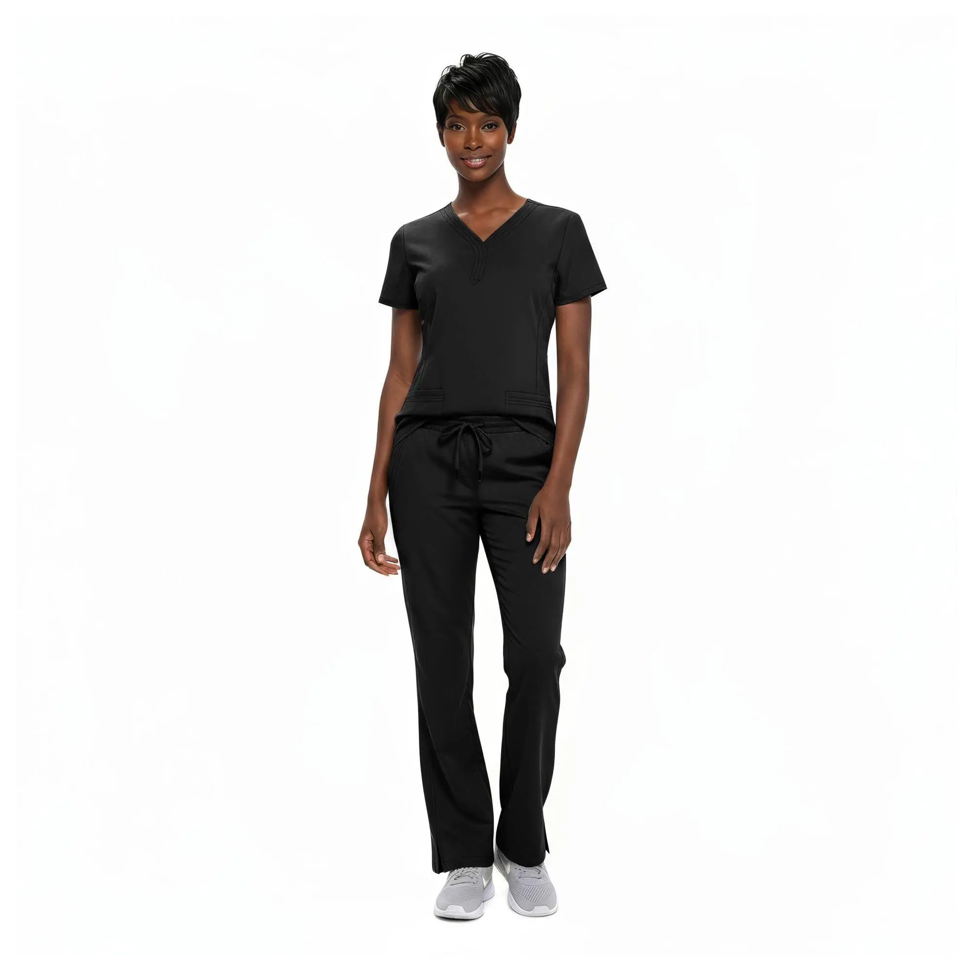 The Y-neck scrub top with 2 pockets offers a sleek, professional design, while the pants with adjustable drawstring and elastic waistband provide a secure, flexible fit.
