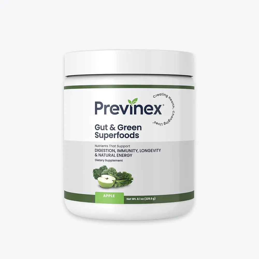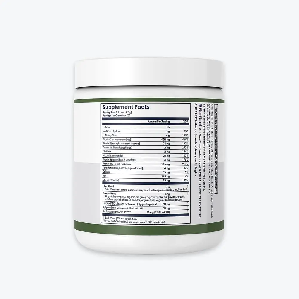 A superfood greens powder packed with organic greens, clinically studied gut health ingredients, and a clinically studied anti-aging ingredient that supports digestion, immunity, longevity, natural energy, and overall health.