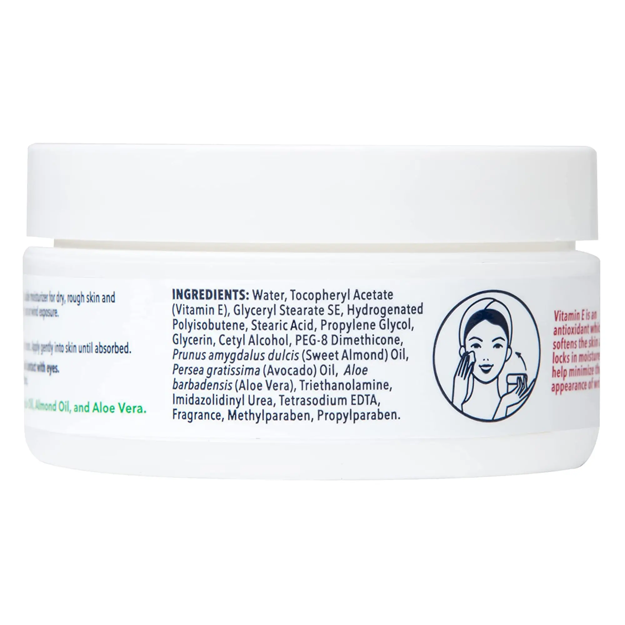 This face cream is perfect for dry skin, enriched with 5000 IUs of vitamin E. It includes avocado oil, sweet almond oil, and aloe vera. Clinically tested, it's non-comedogenic and allergy-tested, ensuring safety for all skin types. Free from artificial colors, gluten, phthalates, and petrolatum. Made in the USA, it's never tested on animals.