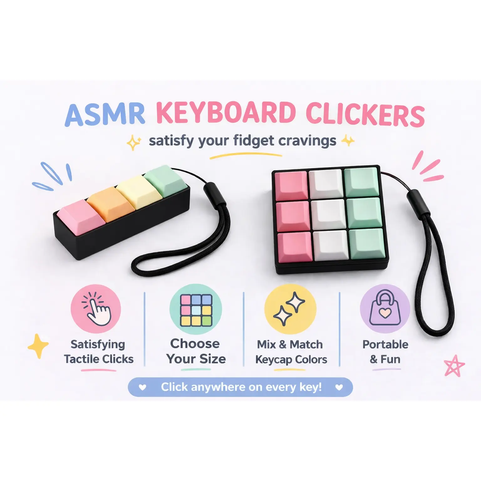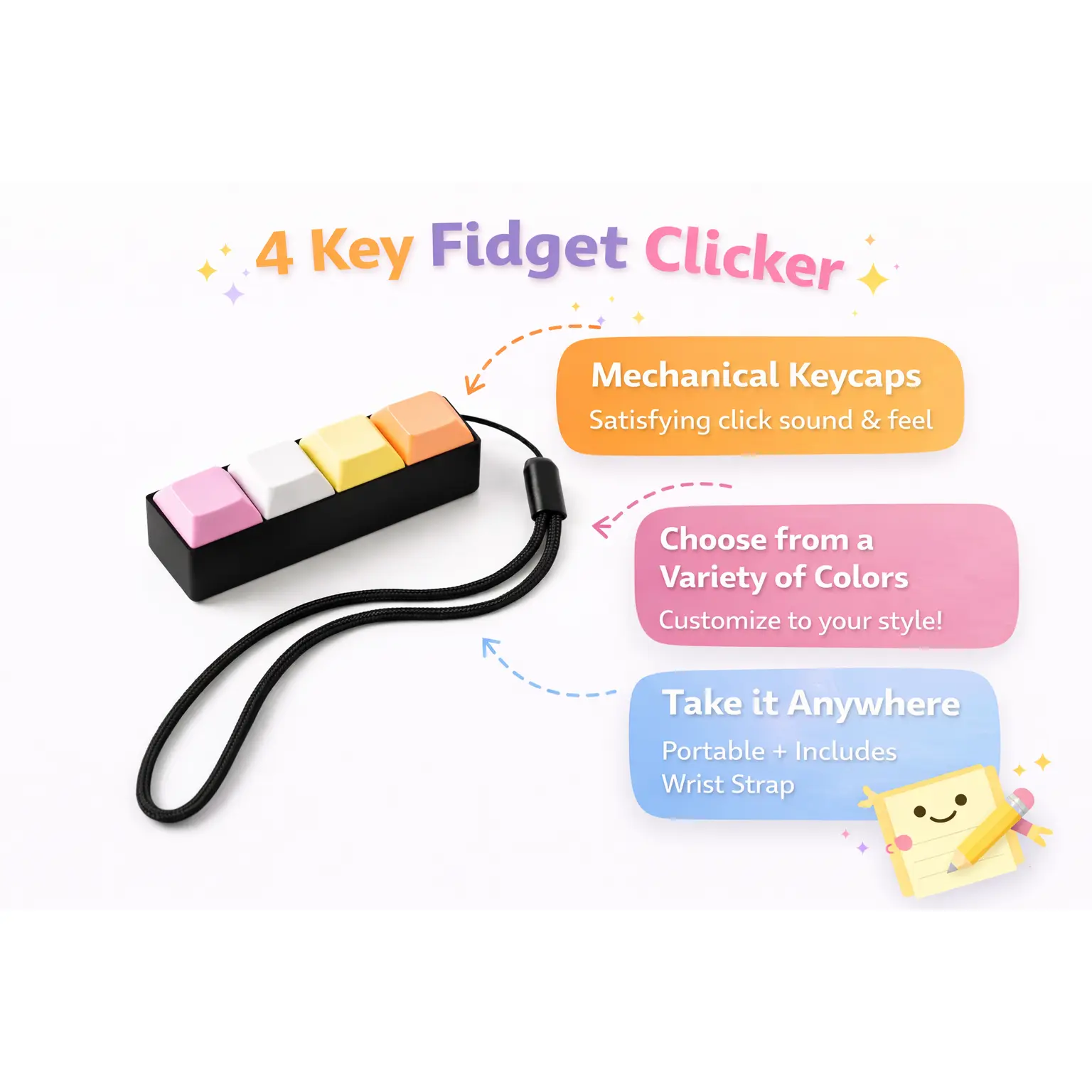 This 4-Key Keyboard Fidget Clicker is designed for anyone who loves the crisp feel of mechanical keyboard switches. With four clickable keys, it delivers satisfying tactile feedback that keeps your hands busy while helping improve focus and reduce stress.