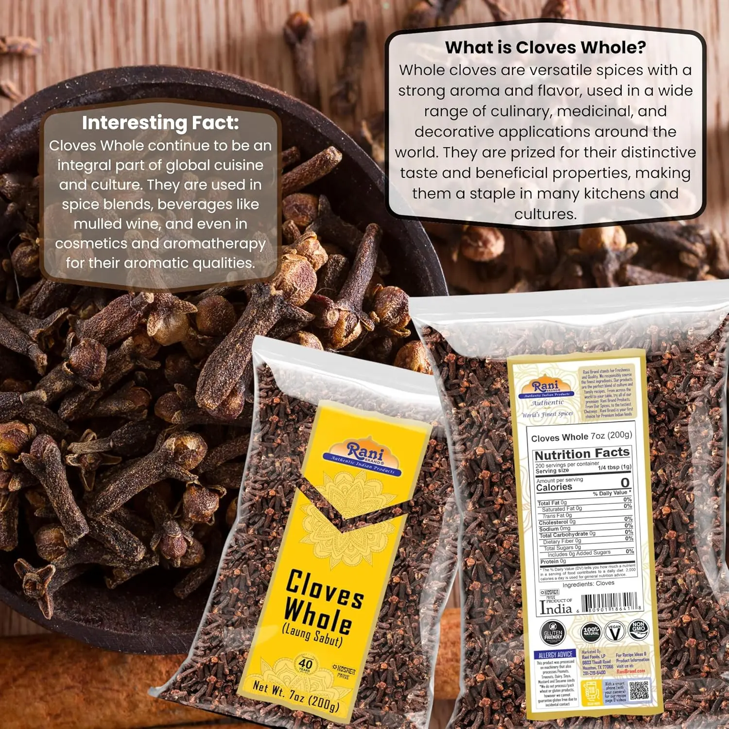 ·are the aromatic unopened flower buds of a small evergreen tree native to the Moluccas (Indonesia). Cloves are essential in garam masala and appear in many curry powder recipes. In Indian cuisine, it lends a hand to chutneys and many pickle dishes. It has also become an major ingredient in many rice recipes such as pullo and biryani. Cloves have an assertive, dark aroma that is warm and rich. Rani Brand are hand selected, and cleaned. They have a high oil content for rich full flavor!