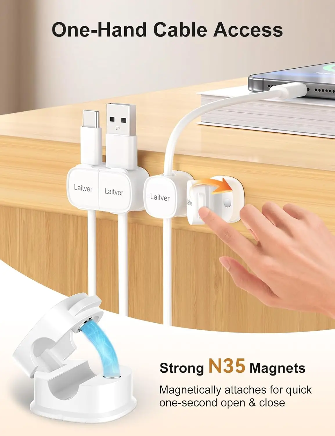 ·Strong Magnetic Suction & One-handed Operation: Each cable clip adopts a unique magnetic opening and closing design, the magnet is automatically and accurately aligned, saying goodbye to the cumbersome traditional cable clip. You can fix or release the charging cable, HDMI, USB and other types of cables with one-handed gently pressing, which is more energy-saving and efficient than the traditional grommets. Side clever design, easy to open, no longer afraid of hurting your nails!