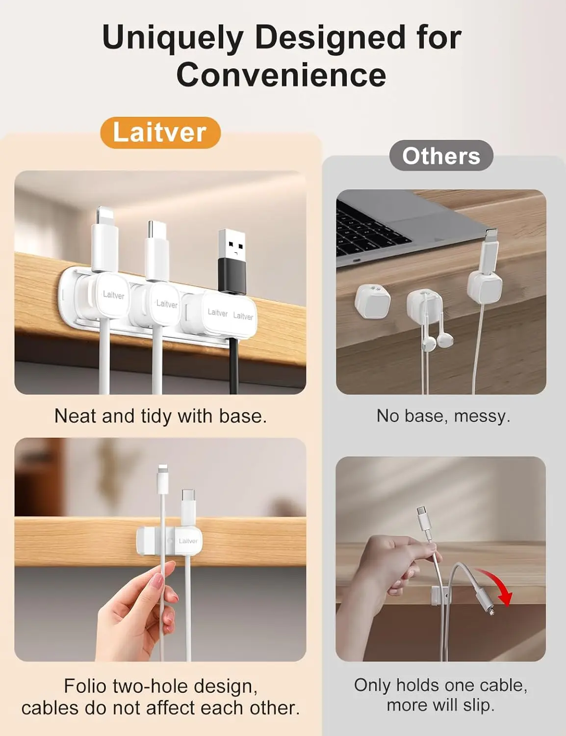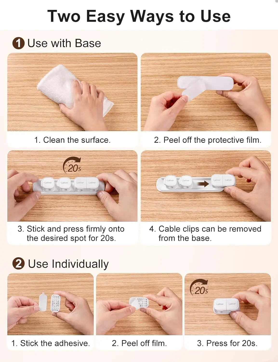 ·Versatile & Flexible Combination: Laitver magnetic cable clips include 4 single cable clips + 2 double cable clips + 2 plastic bases, which can easily meet the needs of organizing 8 cables. The dual cable clip can separate two cables to prevent entanglement; the single cable clip can fix one cable in place, which is ideal for thin cables. The two cable clips can be moved freely on the plastic card base. Whether used alone or in combination, they can meet your various usage scenarios.