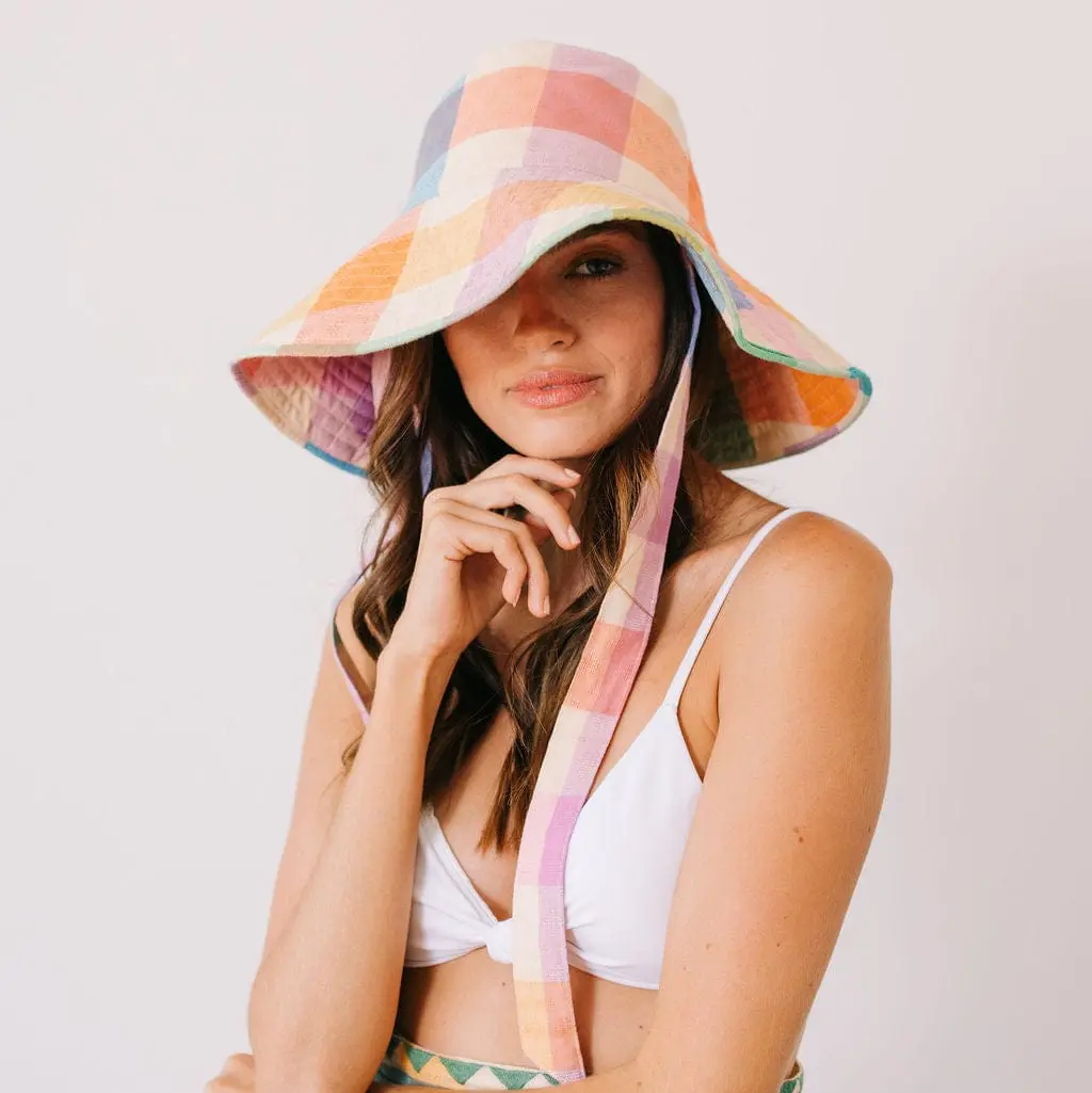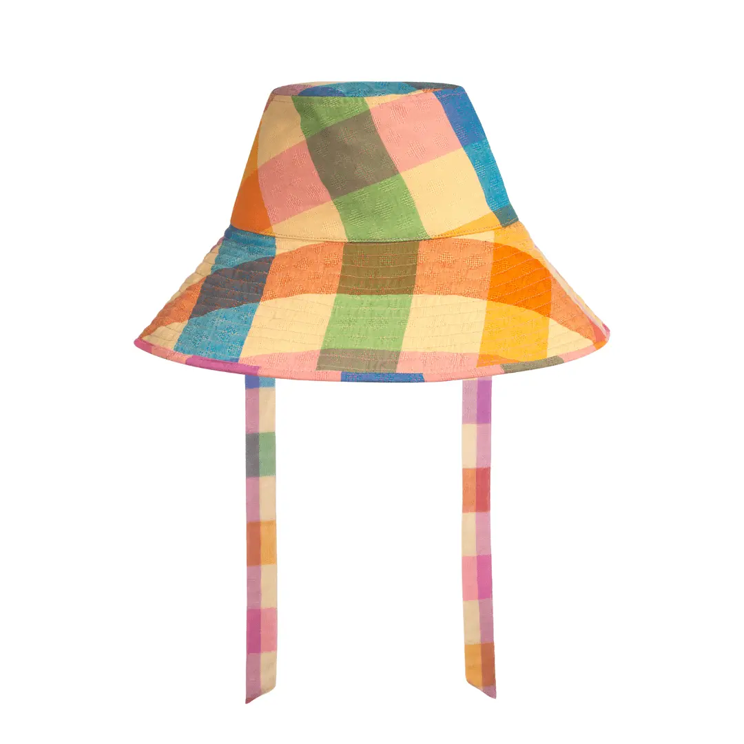The Rainbow Plaid Bucket Hat is a playful essential for sunny adventures. Made from lightweight cotton, this vibrant hat with removable straps features colorful plaid that radiate fun, beachy vibes.