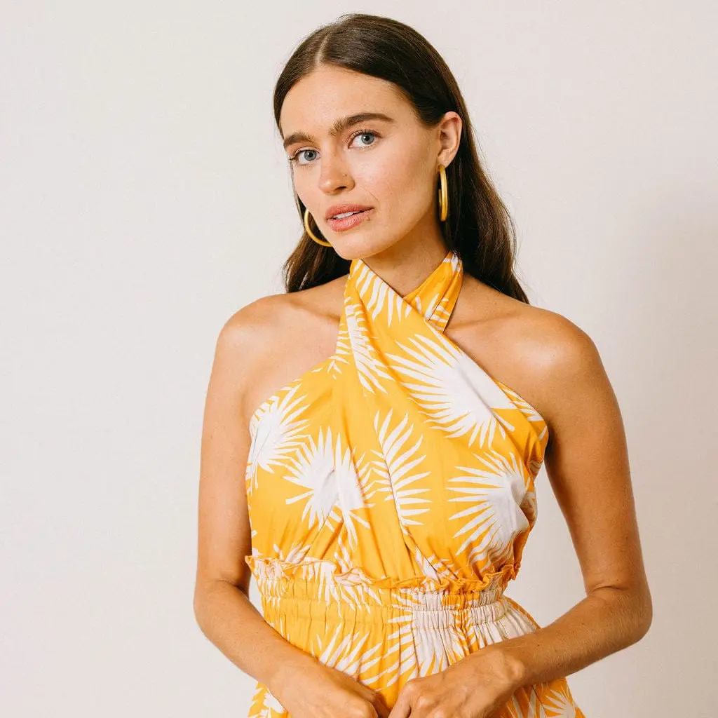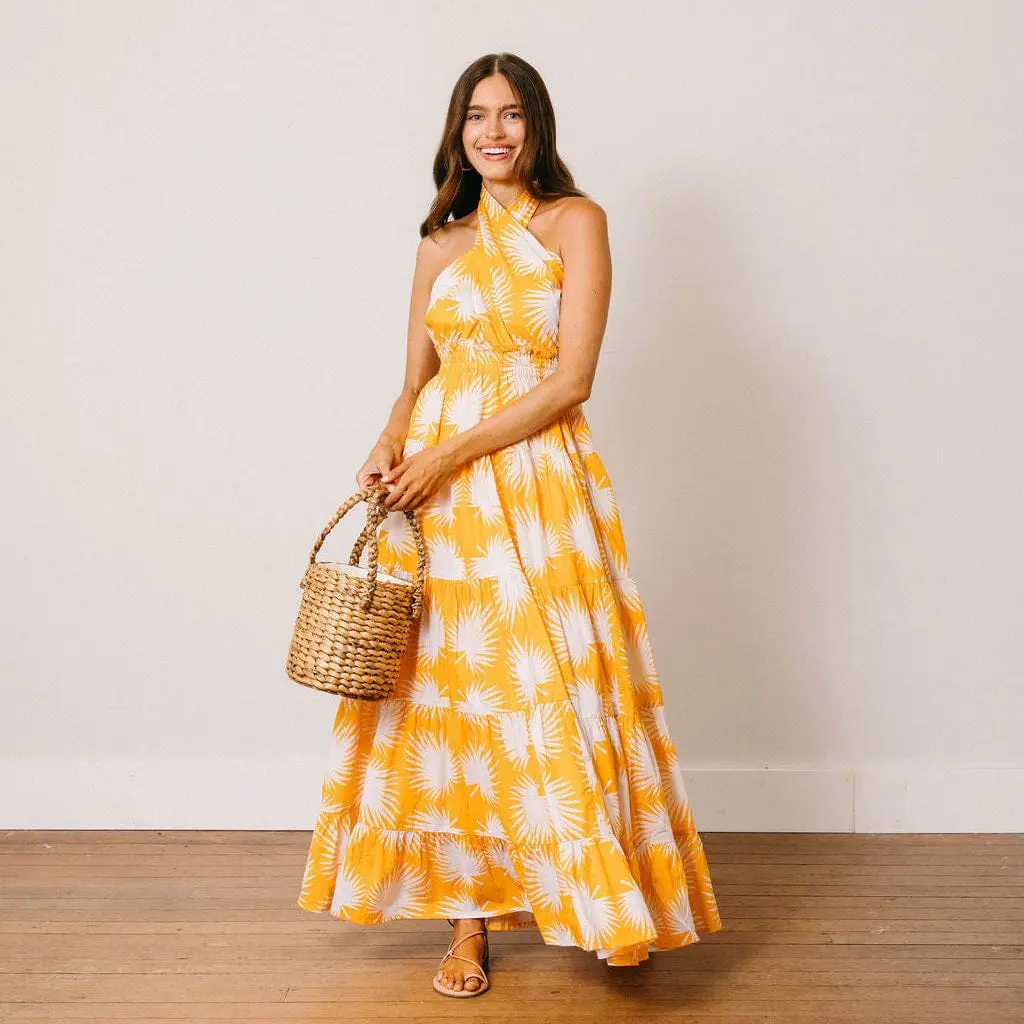 The ultimate vacation-ready maxi dress. The Capri Dress features a flattering halter neckline, smocked waist, and full-tiered skirt for a breezy, feminine fit. With its flowing silhouette and bold back-tie detail, this easy pull-on style is perfect for dressing up or down—whether you're headed to dinner by the sea or strolling through sunny streets.