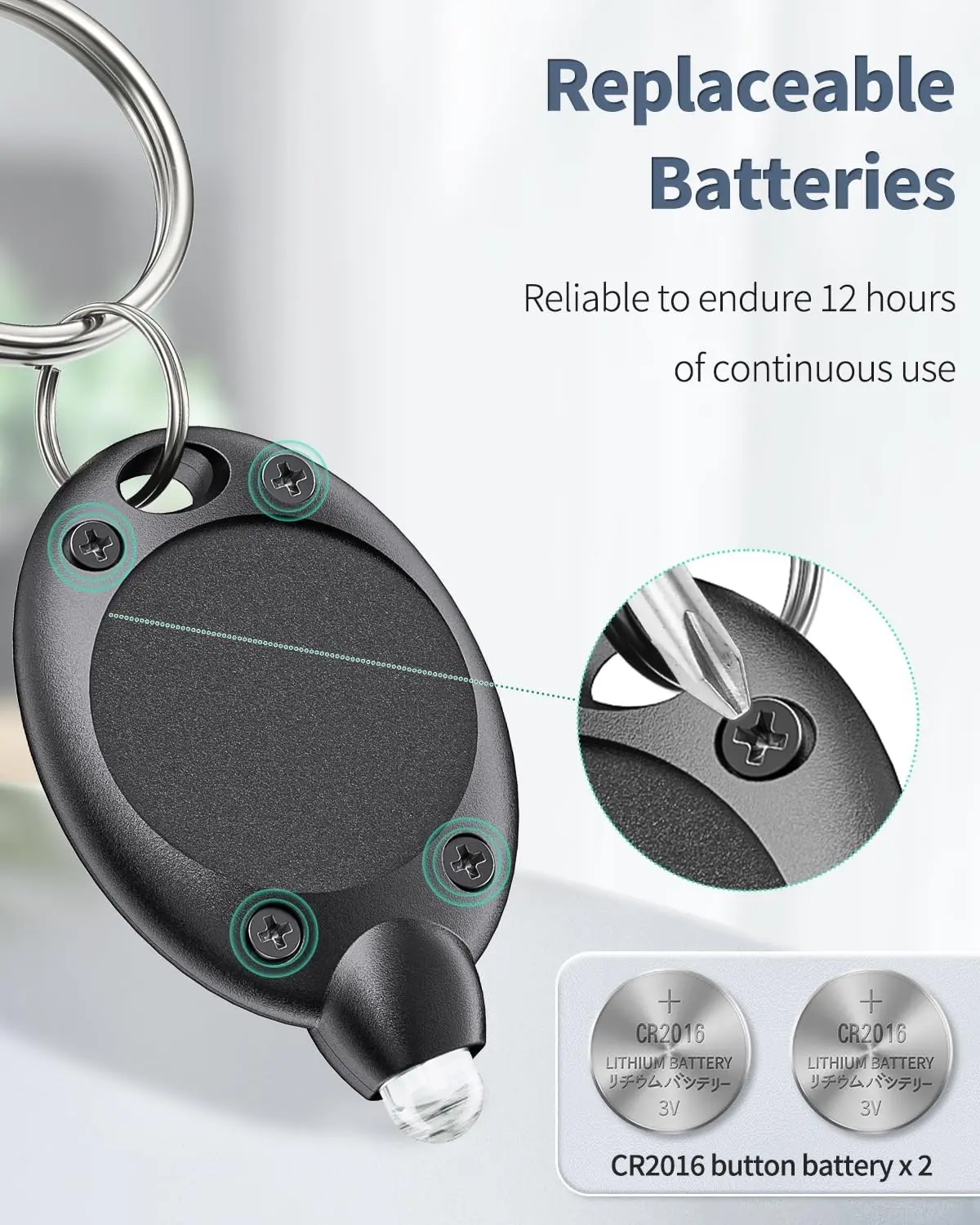 ·Replaceable Batteries: Each keychain flashlight is equipped with 2 CR2016 button batteries. Each battery withstands 12 hours of continuous use. Replace the batteries by opening the shell from the bottom with a screwdriver.