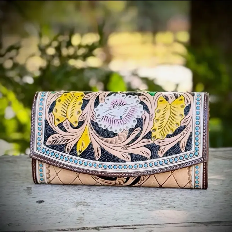 A Western-inspired card holder by Myra, featuring intricate hand-tooled floral detailing. Designed with multiple compartments for easy organization in a slim, stylish profile.