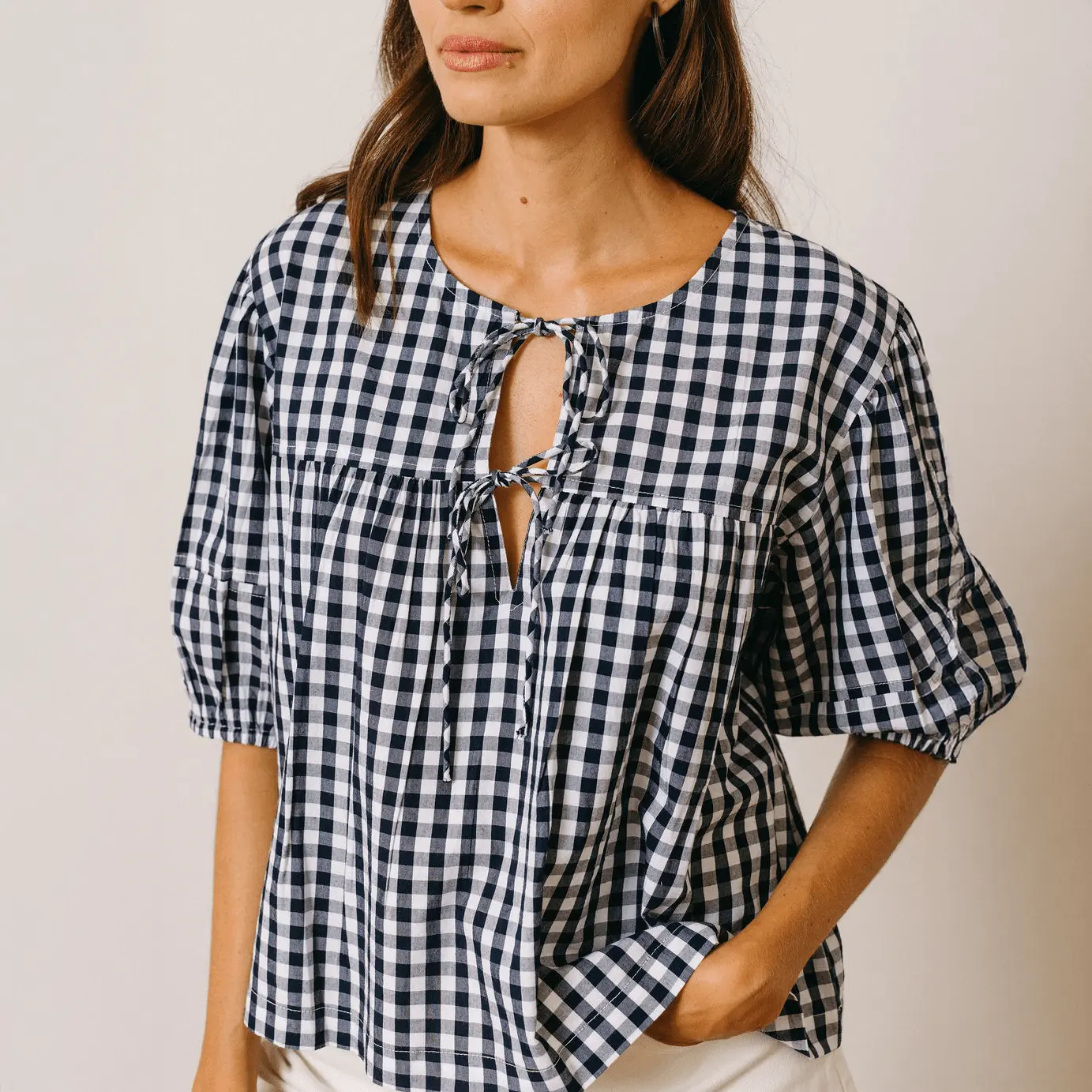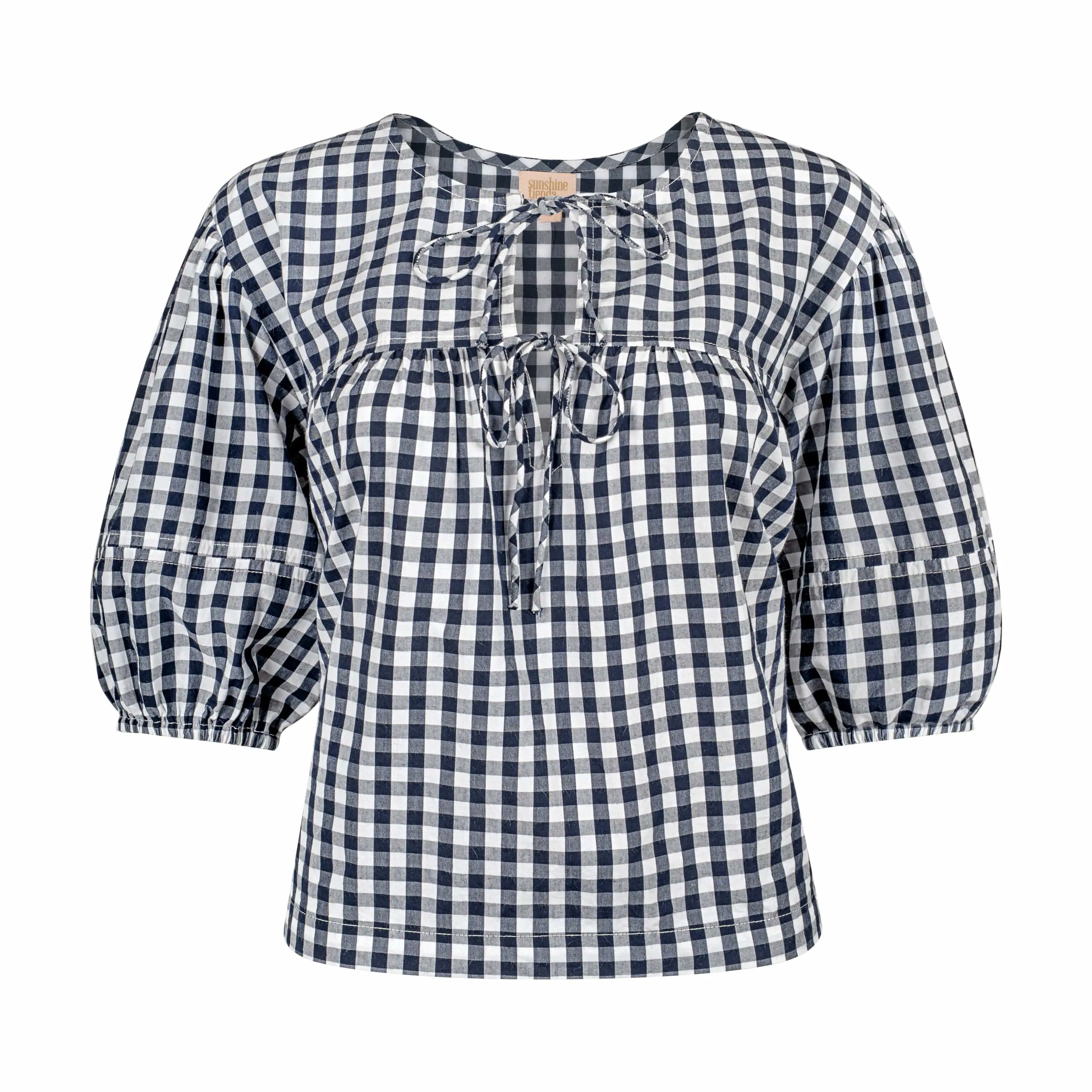 The Navy Gingham Mira Top is going to be your go-to top. The fit is perfect with a blousy body and the perfect puff sleeve. Its classic print, relaxed fit and tie-front neckline make it an effortlessly stylish choice for sunny adventures.