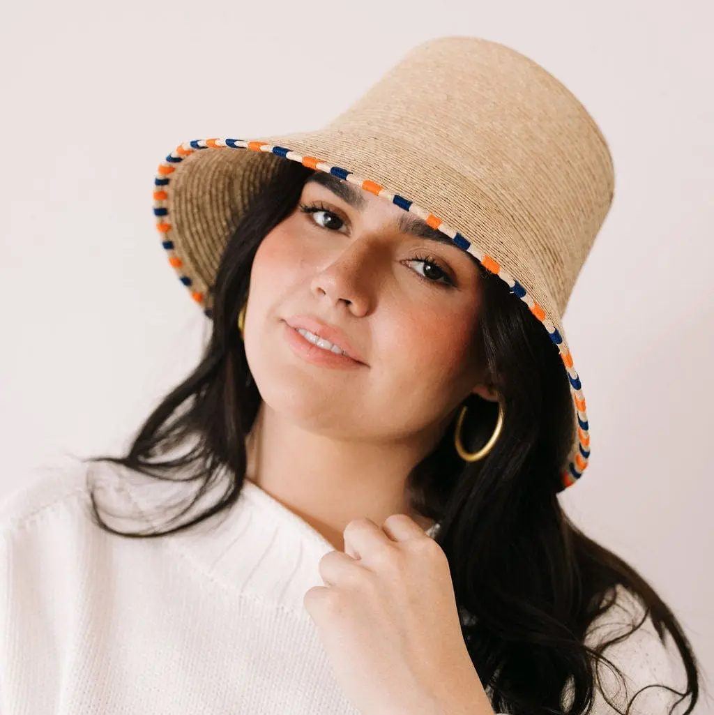 The Blue and Orange Bucket Hat features hand stitched blue and orange stripes along the brim and is a part of our sustainable, fair trade hat collection and graded at the highest UPF rating.