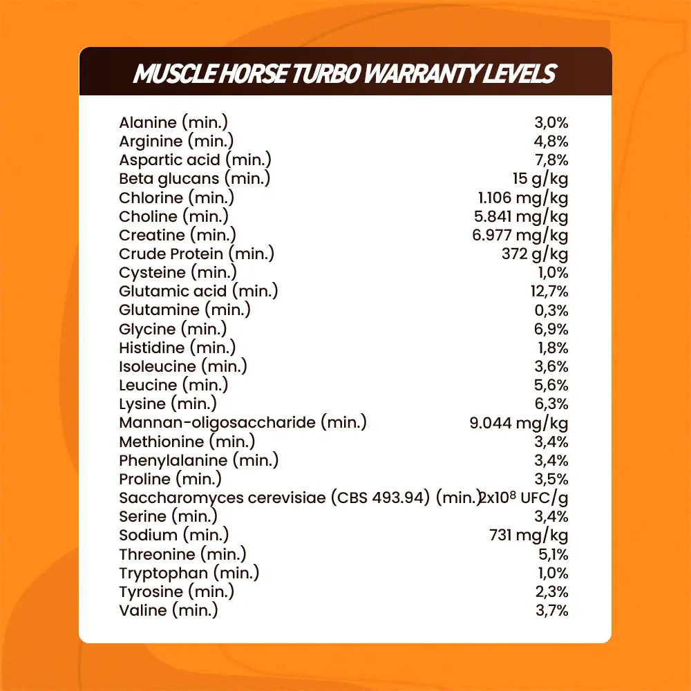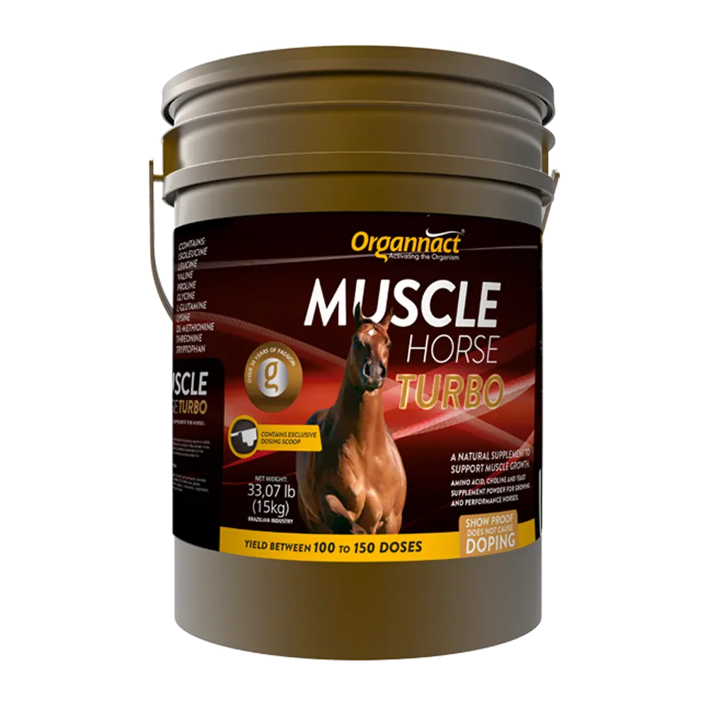 Organnact Muscle Horse Turbo is a nutritional supplement for horses, formulated with amino acids, creatine, choline, and functional yeast. It provides nutritional support for vitality, energy during training, and digestive comfort. Palatable and suitable for use in competition.
