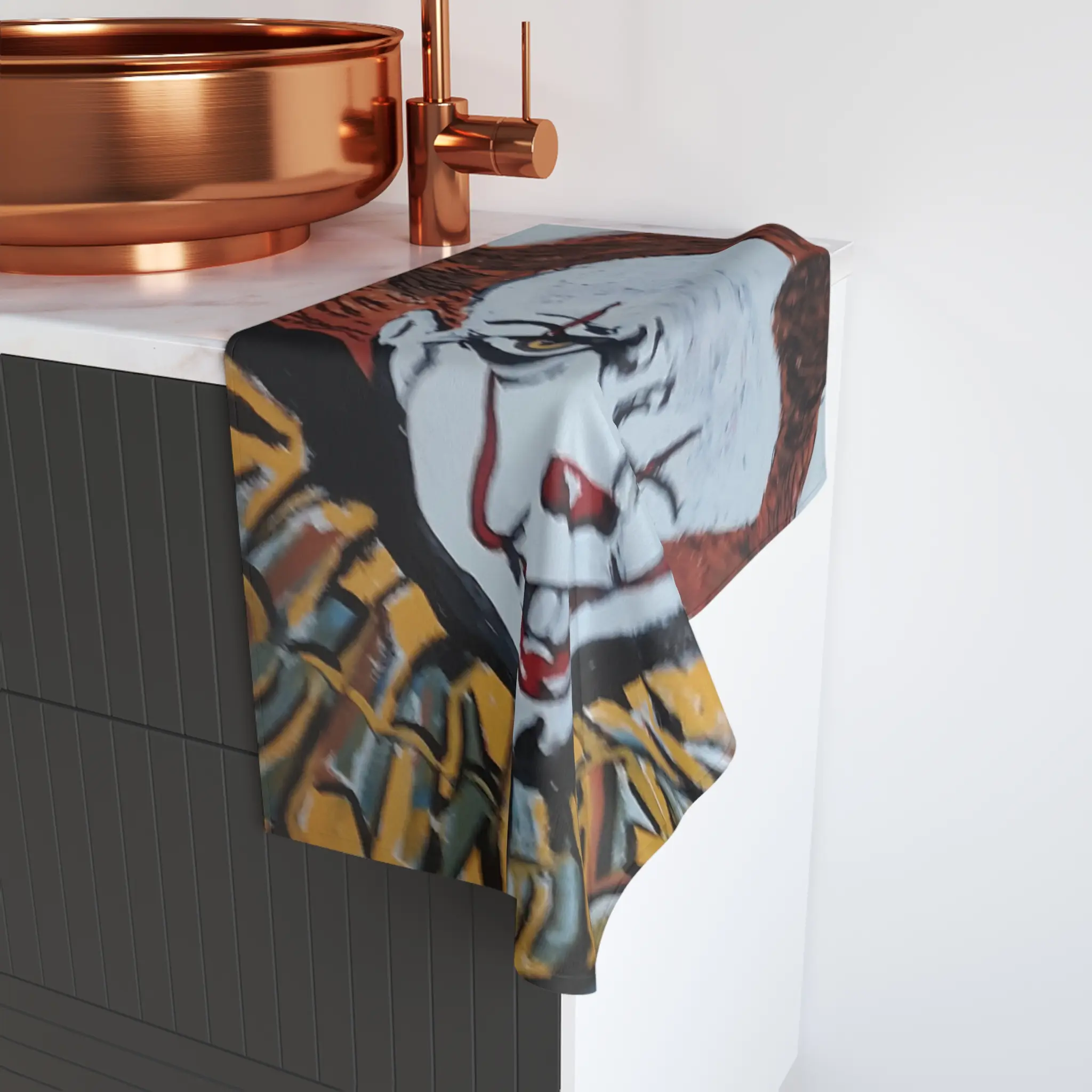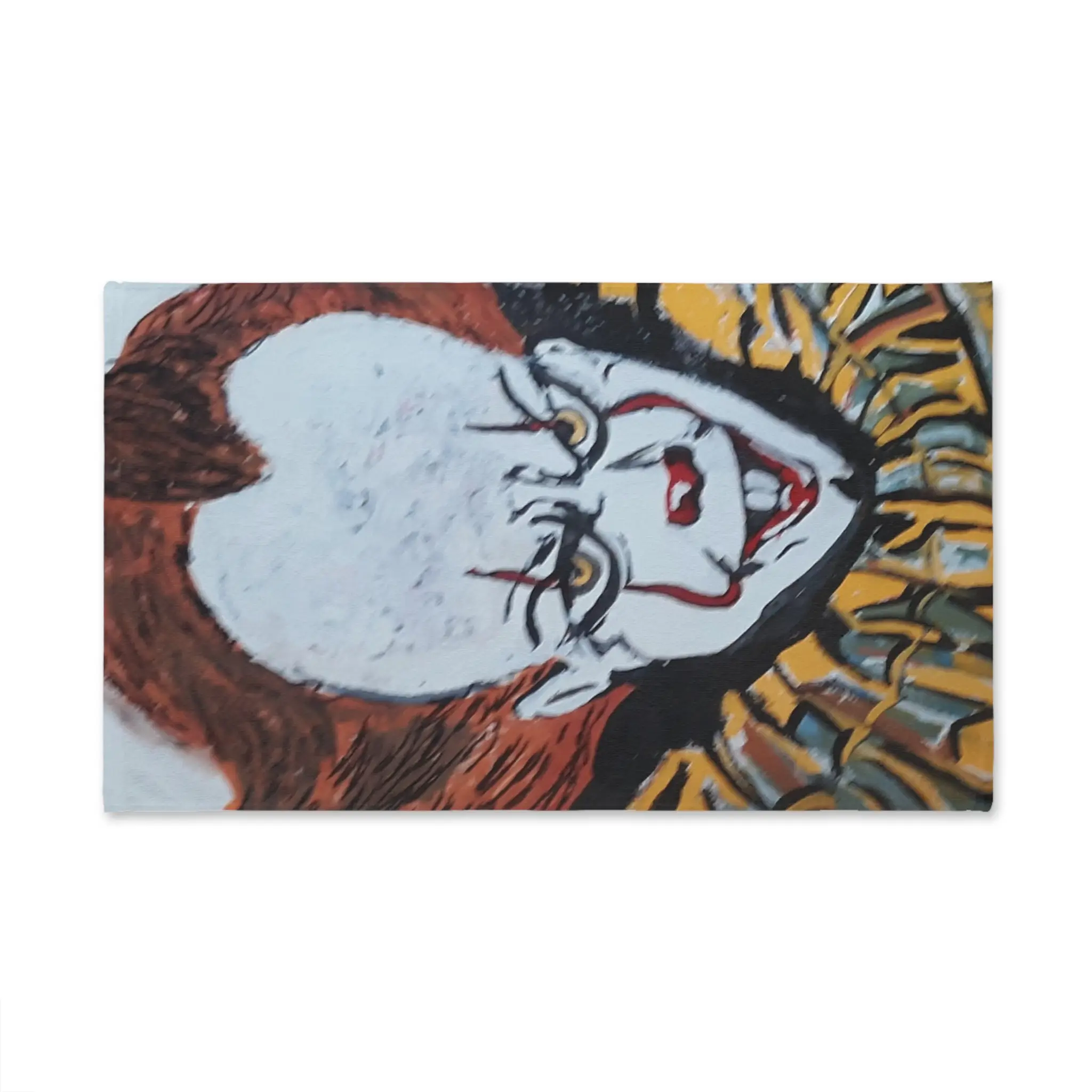 This hand towel carries a bold, eerie portrait that brings a cinematic chill to everyday moments. The printed side shows a stylized clown face with intense eyes and a wide, uncanny grin, rendered in saturated reds, yellows, and stark whites that pop against the towel’s soft fabric. Draped over a bathroom hook or folded on a guest towel rack, it adds playful dread to Halloween setups, horror-movie nights, or any space where fans of spooky art gather. Lightweight and quick-drying, it’s built for repeated use while keeping the artwork bright and sharp season after season.