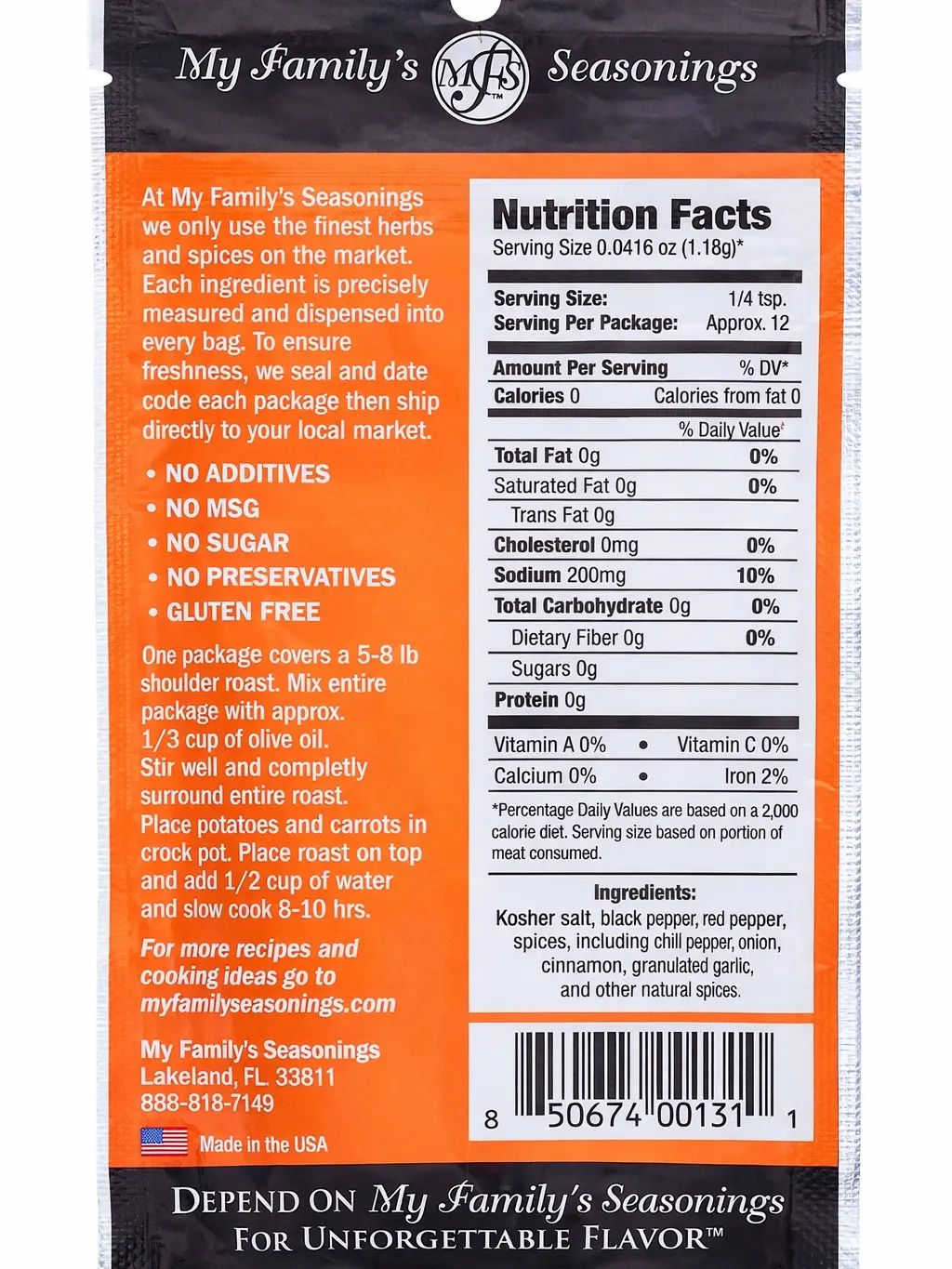 Made with kosher salt, black pepper, garlic, onion, chili pepper, cinnamon, and a signature blend of herbs and spices.
