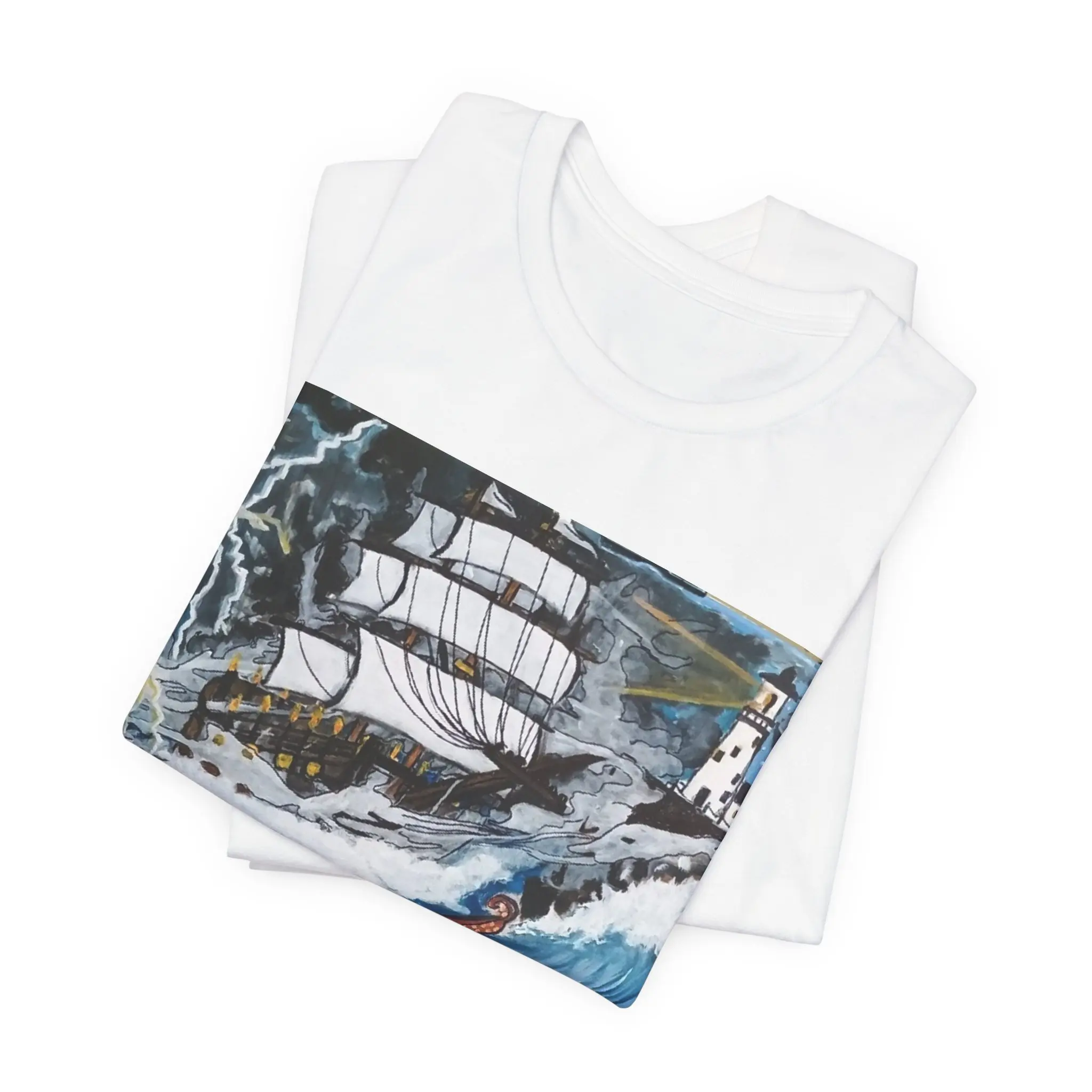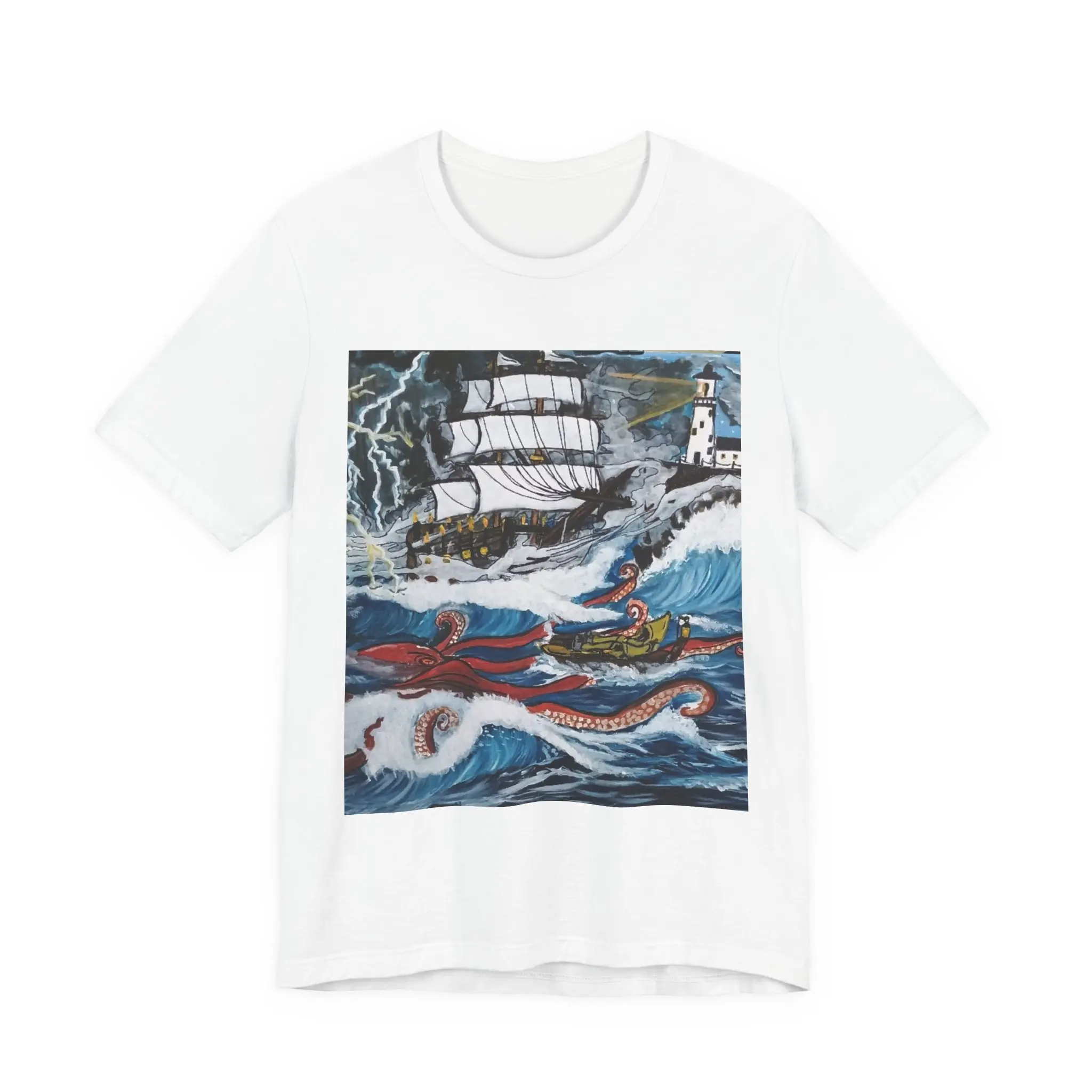 This lightweight jersey tee brings stormy-sea storytelling to your everyday wardrobe. A vintage-inspired maritime scene — a tall ship battling lightning and towering waves while a bright lighthouse watches from shore and a giant octopus coils through the surf — is printed sharply on breathable Airlume combed cotton. The shirt wears like a laid-back layer: crisp crew neckline, side seams for structure, and a tear-away label for comfort. It reads like a sailor’s tale you can move in — great for walks along the harbor, rainy-day adventures, or layering under a jacket when the wind picks up.
