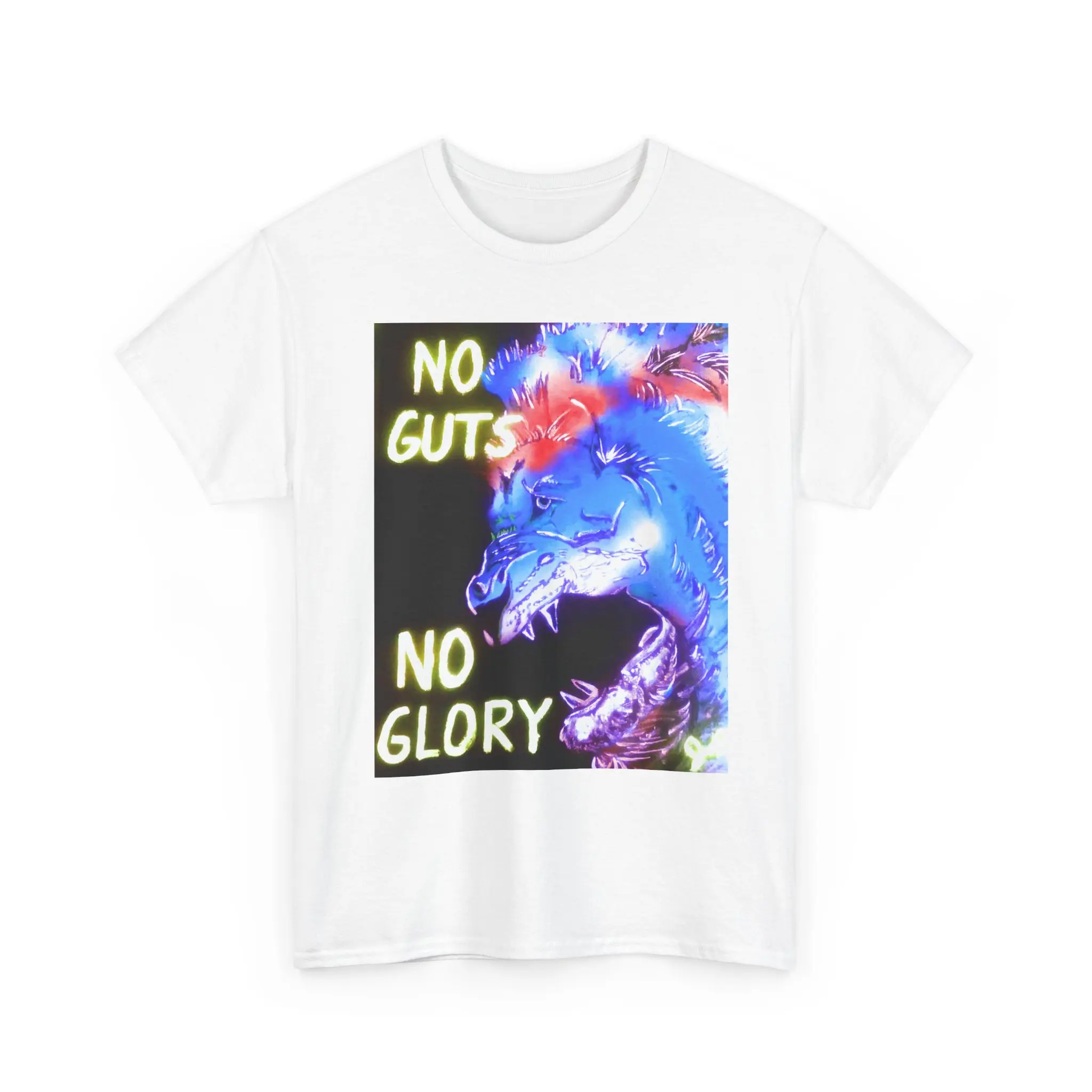 A bold cotton tee that speaks to people who chase adrenaline and creativity. The front features a neon-infused, painterly wolf head and the phrase “NO GUTS NO GLORY,” rendered in vivid blues, pinks and yellows for a punchy, urban-art vibe. It feels like a late-night street mural come to life — loud, defiant, and proud. Slip it on before a skate session, a gig, or when you want your outfit to say you’re showing up fearless. The classic crew neck and relaxed cut keep the attitude wearable every day, while the printed inner label and sleeve details add a subtle designer touch that fans of indie streetwear will notice.